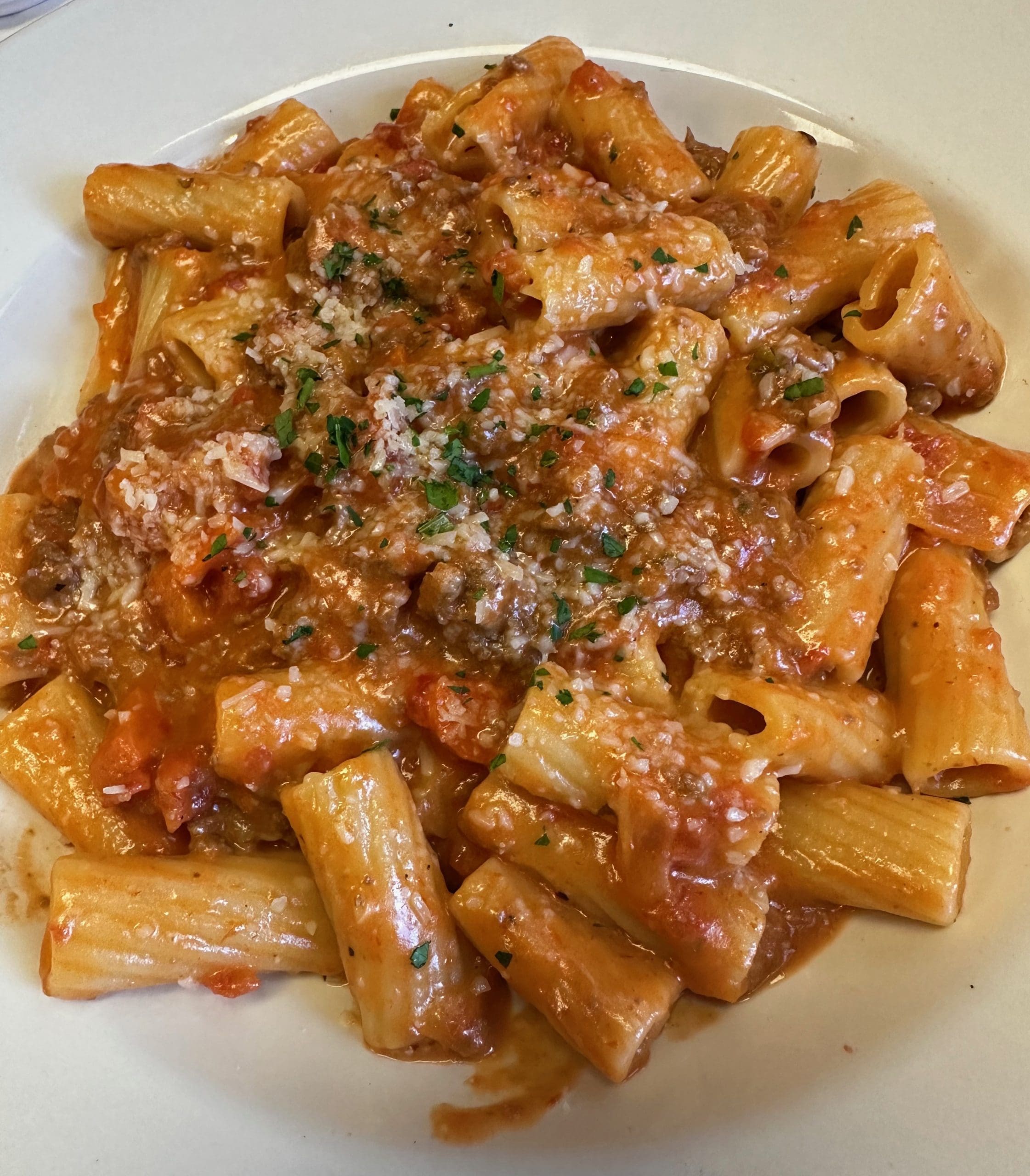 25 April 2024: Pasta Bolo, where have you been all my life? Google “Pasta Bolo” and the results returned will likely be for “Pasta Bolognese,” a dish with which I’m intimately familiar though there are many variations. Il Locatello’s Pasta Bolo combines pork and beef in a red wine ragú alla Bolognese over rigatoni pasta and Parmesan cheese. Interestingly the Bolognese is only one of three sauces which give this dish an interesting twist. It’s also made with marinara and Alfredo sauces. This is a rich, luxurious, absolutely mouth-watering sauce combination that clings to the rigatoni (my favorite pasta) seductively. With any type of Bolognese, a pasta with a hole is best so you can maximize the capture of that sauce. Already this is one of my favorite Italian dishes in Albuquerque. 13 August 2024: Our friend John Martin, a bona fide volcano-eater “adulterated” his Pasta Bolo dish with Calabrian chili oil and chili flakes. His penchant for piquancy is prodigious. He just can’t get enough heat for his asbestos-lined mouth.