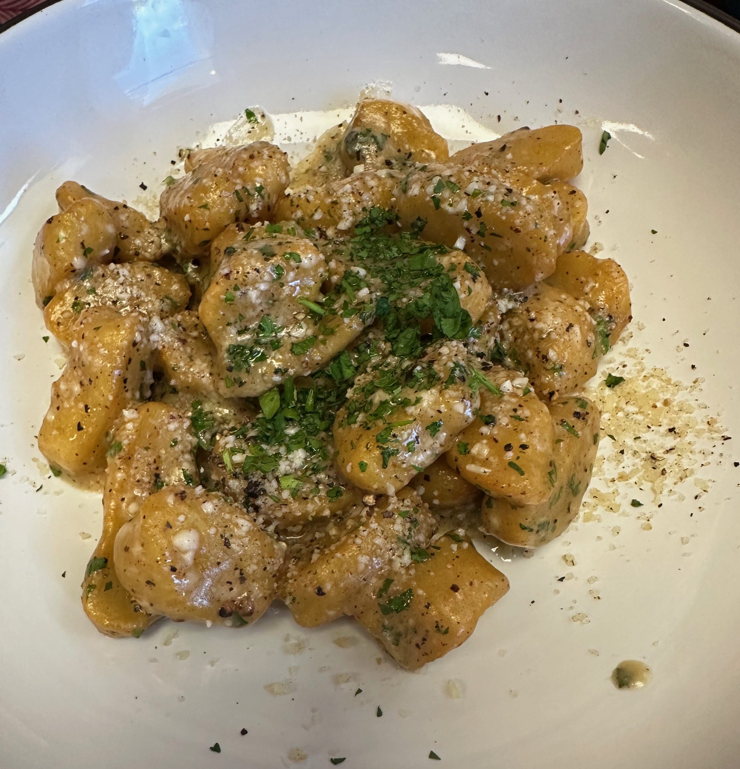25 April 2024: In recent years, few Italian dishes have made such inroads into America’s culinary landscape as cacio e pepe, a a traditional Roman pasta dish with only four ingredients: spaghetti, black pepper, Pecorino and Parmesan. Cacio e Pepe which translates from Italian to “cheese and pepper” is widely considered one of Rome’s most significant culinary creations (along with pasta carbonara). Most restaurants serve cacio e pepe with a spaghetti-like pasta. Il Locatello’s serves a unique gnocchi cacio e pepe (pan-seared homemade potato dumplings, black pepper, Parmesan, Pecorino cheese and truffle oil). Texturally, it’s quite unlike the mushy mashed potato-like dumplings typically called gnocchi. The truffle oil and pepper combination give this dish a bit of assertiveness and punch.