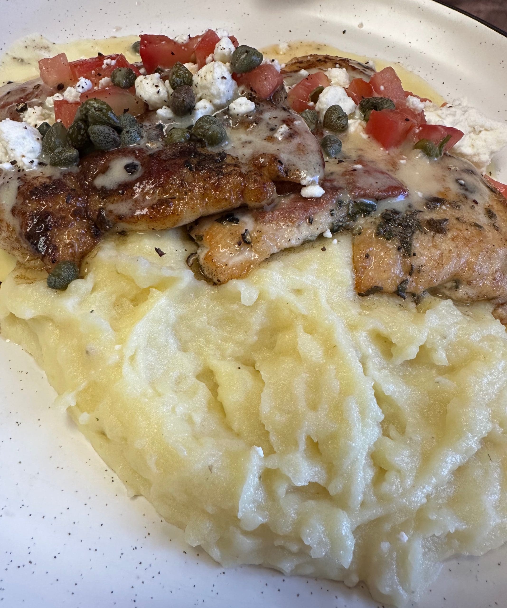 Chicken saltimbocca (lightly breaded chicken breast, prosciutto, sage, capers, marinated tomatoes, feta, Dijon lemon butter) was Nancy’s entree of choice. It’s a beautiful dish with three thin chicken cutlets on top of creamy, buttery mashed potatoes. The combination of flavors in concordant competition for the rapt attention of your taste buds is a wonderful thing to experience. Capers are an unsung, underappreciated ingredient. Pair capers with Dijon lemon butter and you’ve got a flavor profile that combines a lemony, briny tang with salty, savory and acidic notes. These flavors work exceptionally well on chicken cutlets.