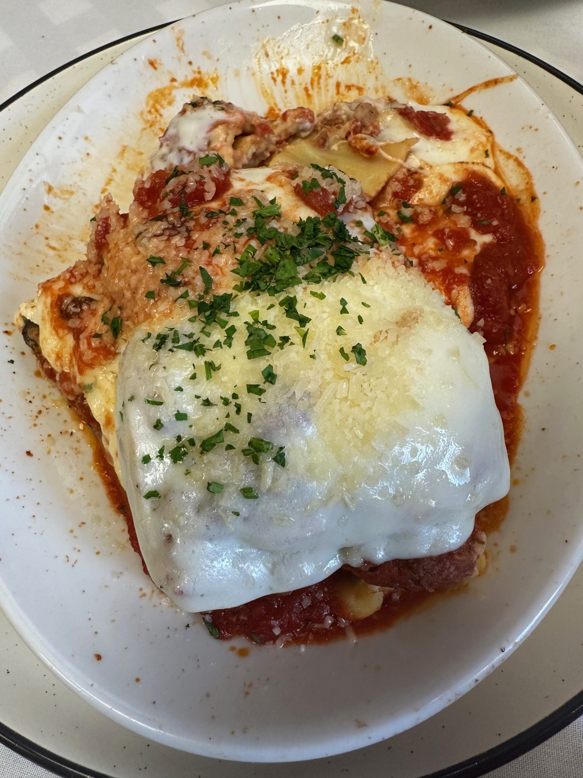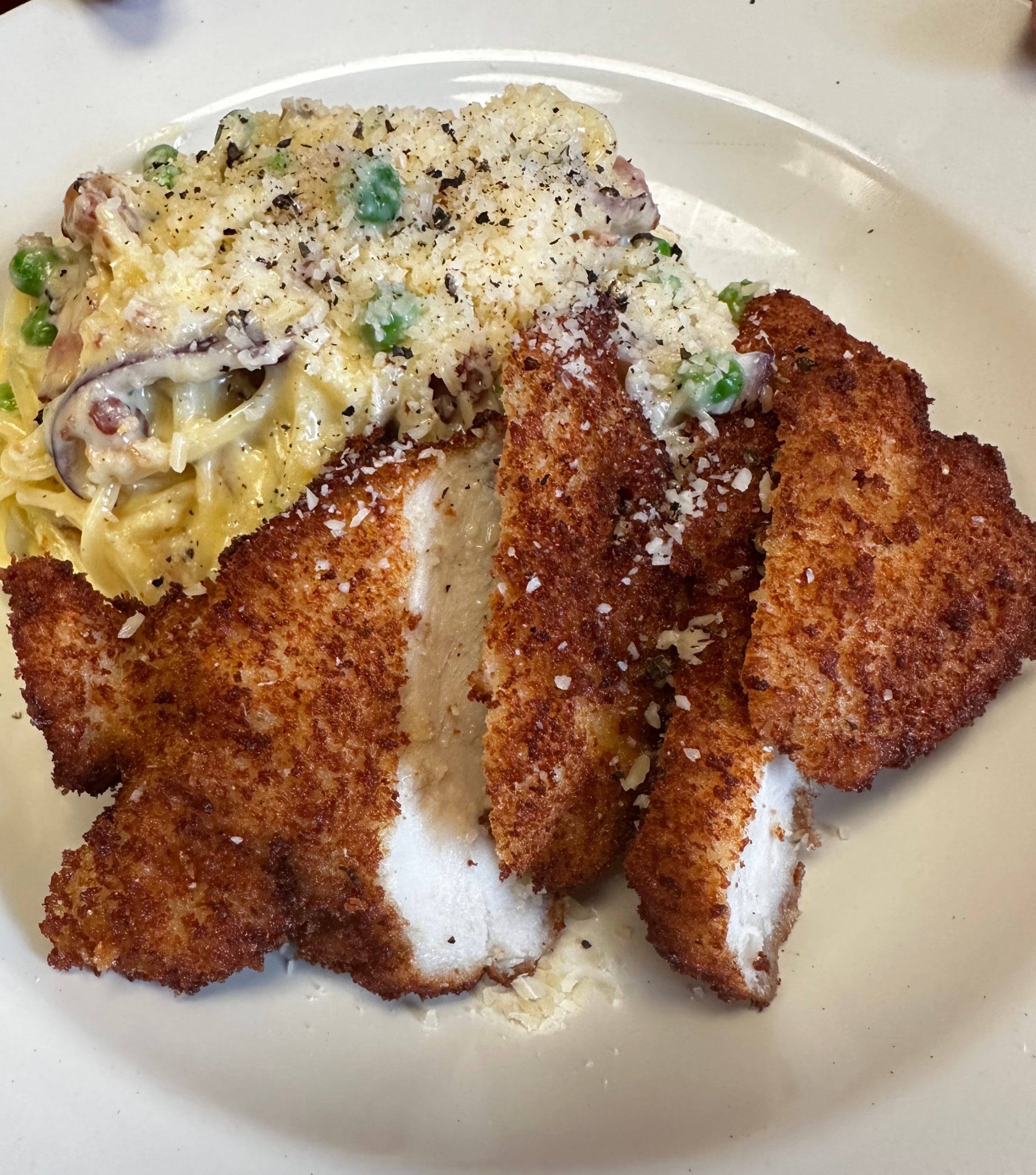 25 April 2024: Linda’s lunch entree was chicken carbonara (bacon, red onion, peas, carbonara sauce, spaghetti pasta and crispy Romano chicken). Chicken Romano, a dish consisting of chicken breast fillets crusted with Romano cheese was a highlight. All the national chicken finger restaurants opening franchises in the metropolitan area could take a lesson or ten from Il Localetto whose Chicken Romano is fabulous. So is the carbonara, a rich and delicious Roman pasta dish. Red onions were a surprising addition and certainly not traditional, but we enjoyed them nonetheless.