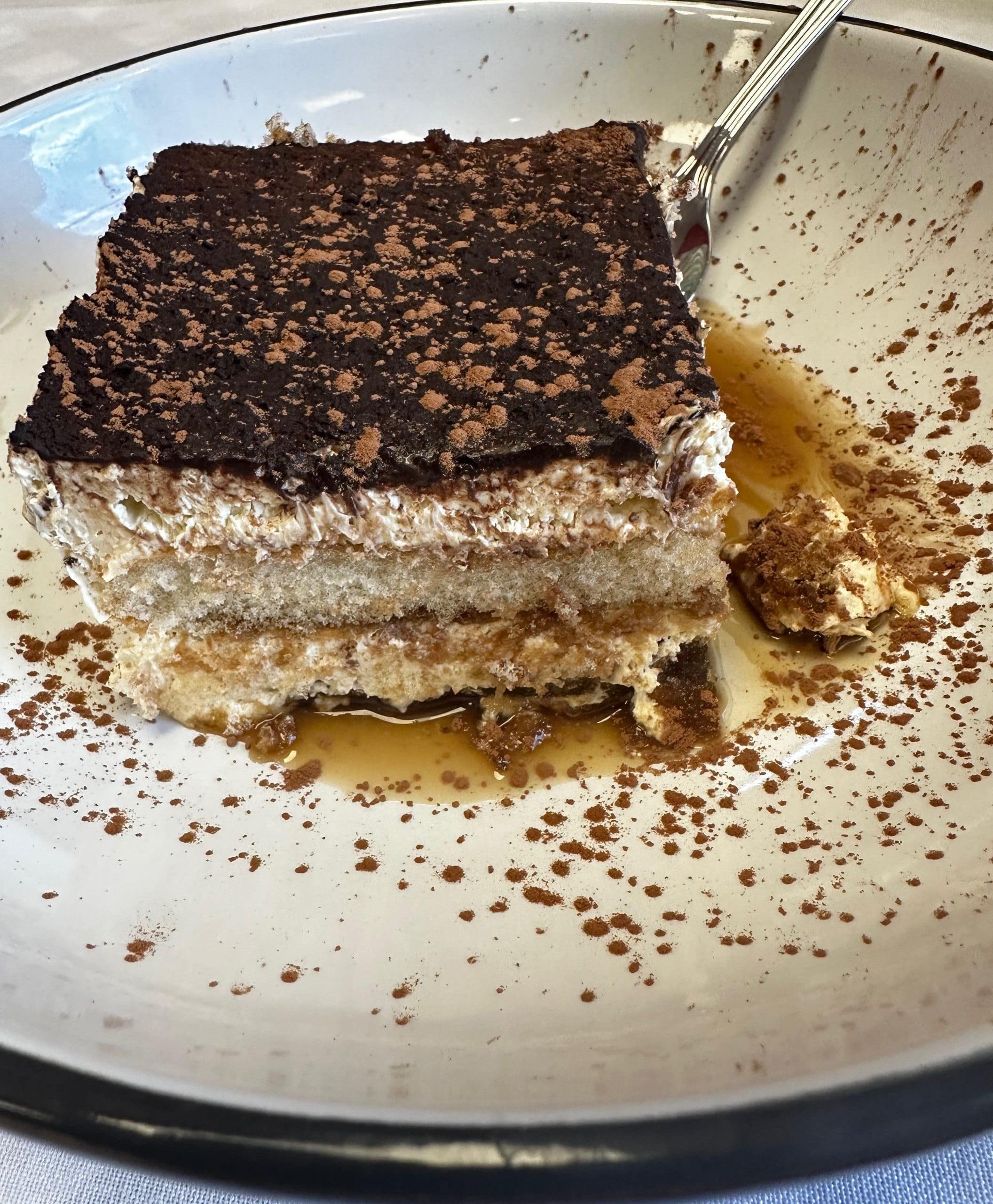 25 April 2024: Il Localetto’s desserts are quite good, too. My Kim had her usual two scoops of gelato–vanilla and salted caramel. Indicative of how much she liked them, she didn’t offer me a single bite. Of course, her retort is that she didn’t have a bite of the tiramisu. In my defense, my Kim hates tiramisu. Nancy and I both had (and both loved) tiramisu. She made sure my photographs captured the layers of espresso-soaked ladyfingers and mascarpone cream Dusted with cocoa, the tiramisu is a wonderful adult dessert.
