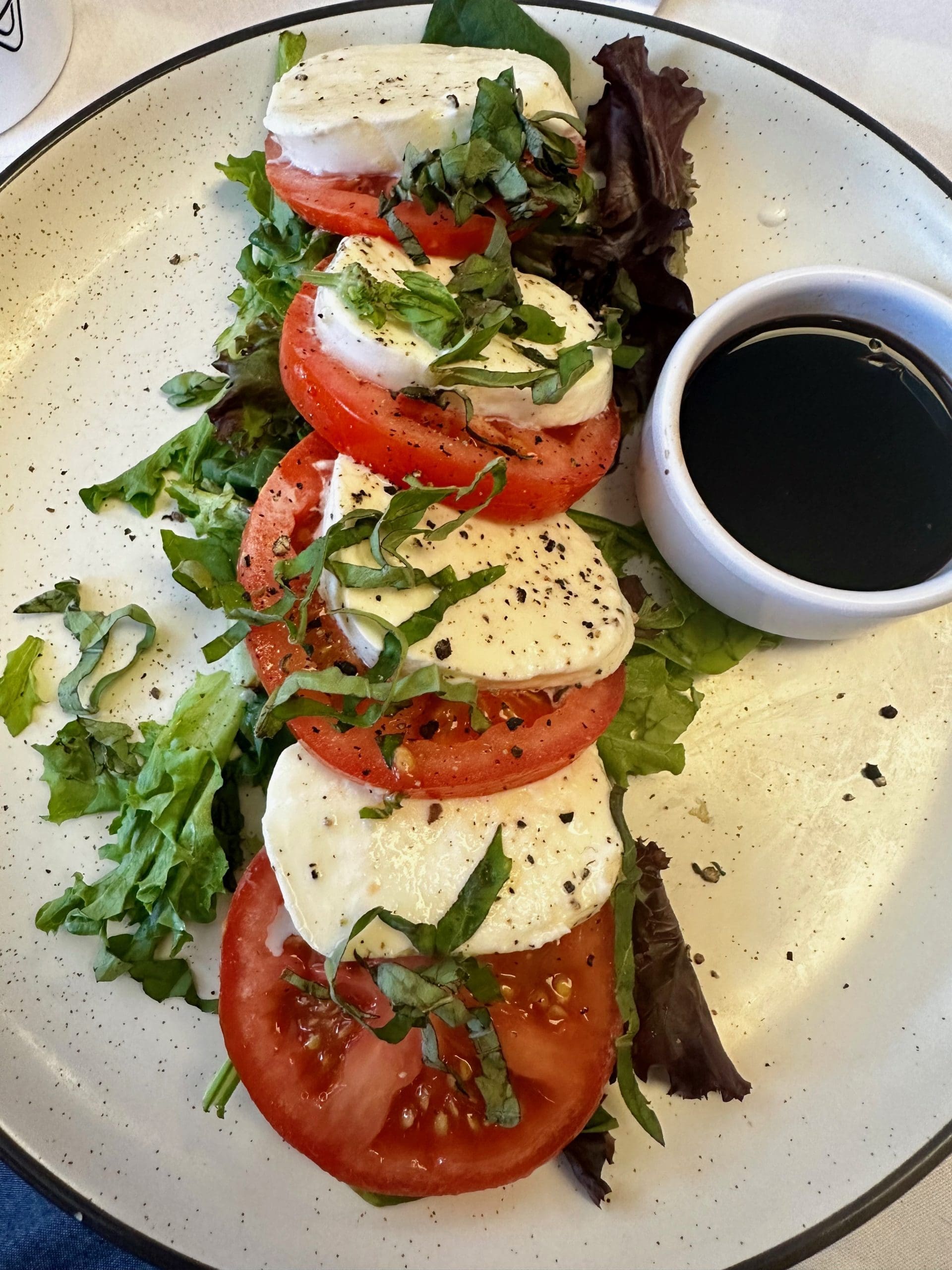 13 August 2024: Il Localetto Rossi’s menu lists four salads and one soup, Pomodoro Zuppa (creamy tomato bisque with crispy croutons and Parmesan cheese). My Kim is on a Caprese salad (marinated tomatoes, fresh mozzarella, basil and Balsamic reduction) kick of late. Caprese salads, she tells me, are not only delicious, but very healthy and low in calories (about 250 calories per serving). Traditionally made with tomatoes, mozzarella, fresh basil, and Balsamic dressing, a good Caprese salad bespeaks of summer.