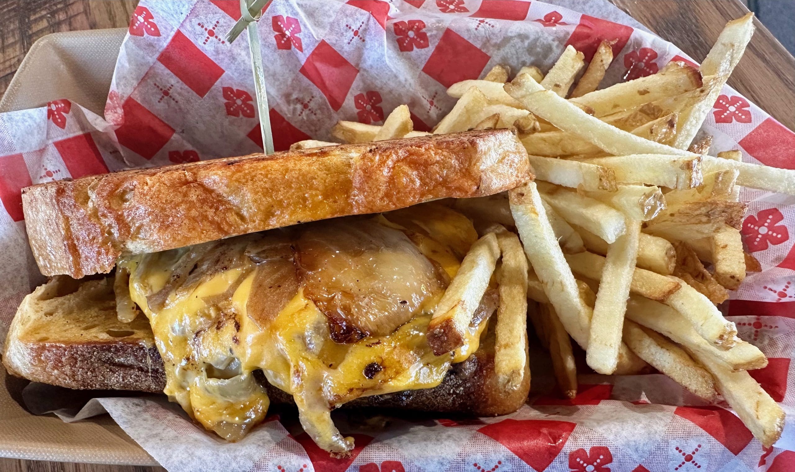 1 May 2024: My Kim, maybe the only carnivorous American who doesn’t especially like burgers, had the patty melt (one-third beef patty, grilled onion, American and Cheddar cheeses, big bad sauce) sans big bad sauce. There’s not much that makes this patty melt a stand-out from other patty melts. Well, maybe for the thicker than most bread which is needed because the beef patty is thicker than most. As with the burgers, fries are available for two dollars more. Though the menu indicates these fries are fresh-cut, they had the taste and feel of fries out of a bag. Their saving grace was lots of salt.