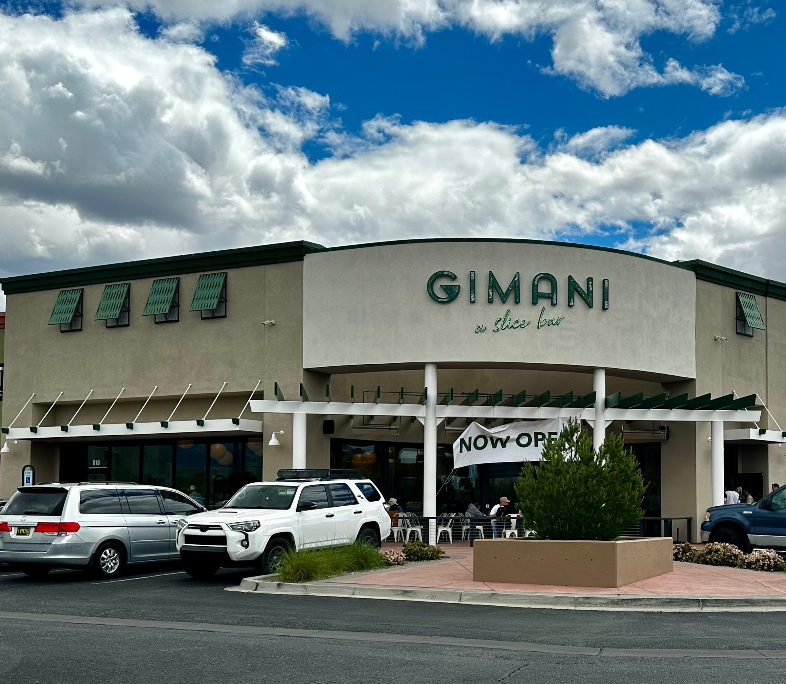 Albuquerque isn’t nearly as compressed as New York City nor does it have New York’s scarcity of parking slots (which may partially explain why New Yorkers walk from place-to-place). I don’t recall ever seeing anyone in the metropolitan area eating a slice of pizza while they walk anywhere save for maybe walking to the fridge. Duke City diners either take pizza home for couch consumption or we eat at the pizzeria. Most of us can’t walk and chew crust at the same time. It made me question why a new pizzeria–Gimani: A Slice Bar–would specialize in pizza by the slice. That’s a unique concept for a city in which everyone drives to the mailbox half a block away and everywhere (and everywhere else).