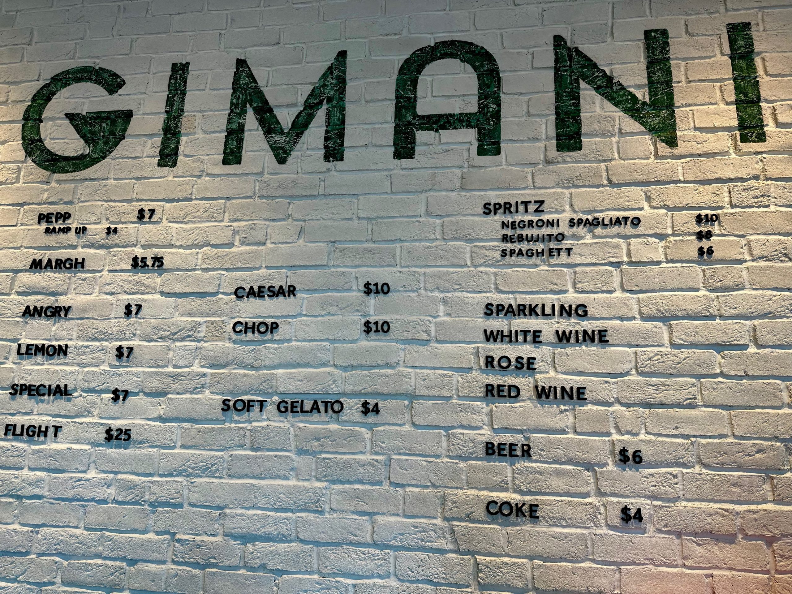 Slices at Gimani are about the size you might experience with a “Large” pizza at most pizzerias. In other words, they’re gigantic. Order the “flight” only if you’re a big eater or (as I did) you want to experience each specialty slice during your visit so you can figure out which one or two to order next time. Eat too many flights and you will be a big eater. Eaters with avian appetites (like my Kim) will struggle to finish one slice. As the photo (above) of the flight shows, four slices nearly fill up an entire pizza platter. By the way, Gimani’s menu also provides a wine pairing for each slice.