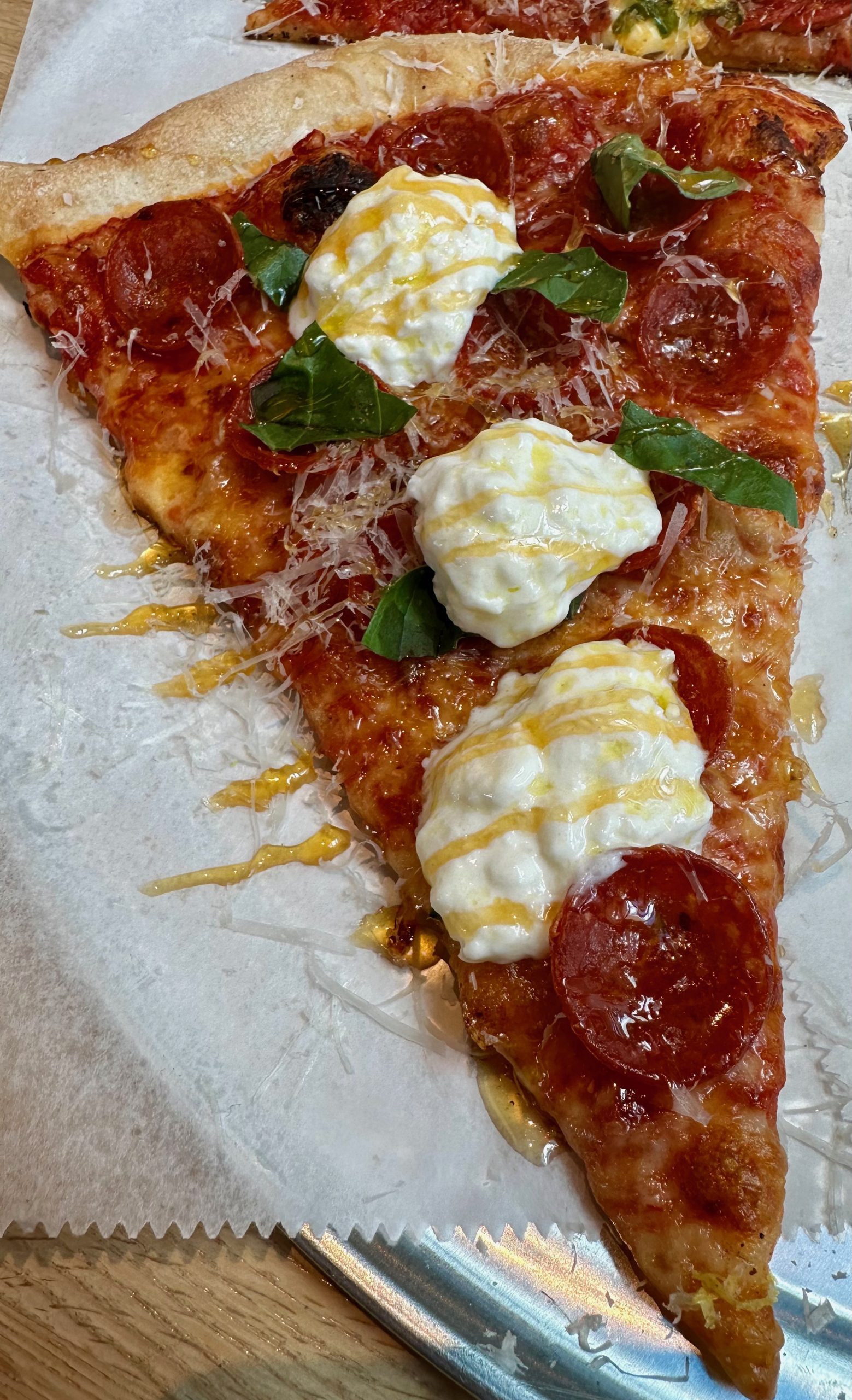 Not surprisingly my favorite of the four slices was the Pepp (pepperoni, house hot honey, tomato, fresh and aged mozzarella). What I loved most about the Pepp was the generous slathering of hot honey. The hot honey “thing,” by the way began in 2003 though it didn’t make it to the Land of Enchantment until Thicc Pizza introduced it on a Detroit-style pie I dream of. Not every marriage of sweet and savory ingredients works well. It works well on the Pepp because everything else on the pie is already very good. The hot honey seems to make every other ingredient “pop,” accentuating the savory, fattiness and acidic components of the pie stand out. Instead of a flight, I’ll order two, three or maybe four slices of the Pepp next time.