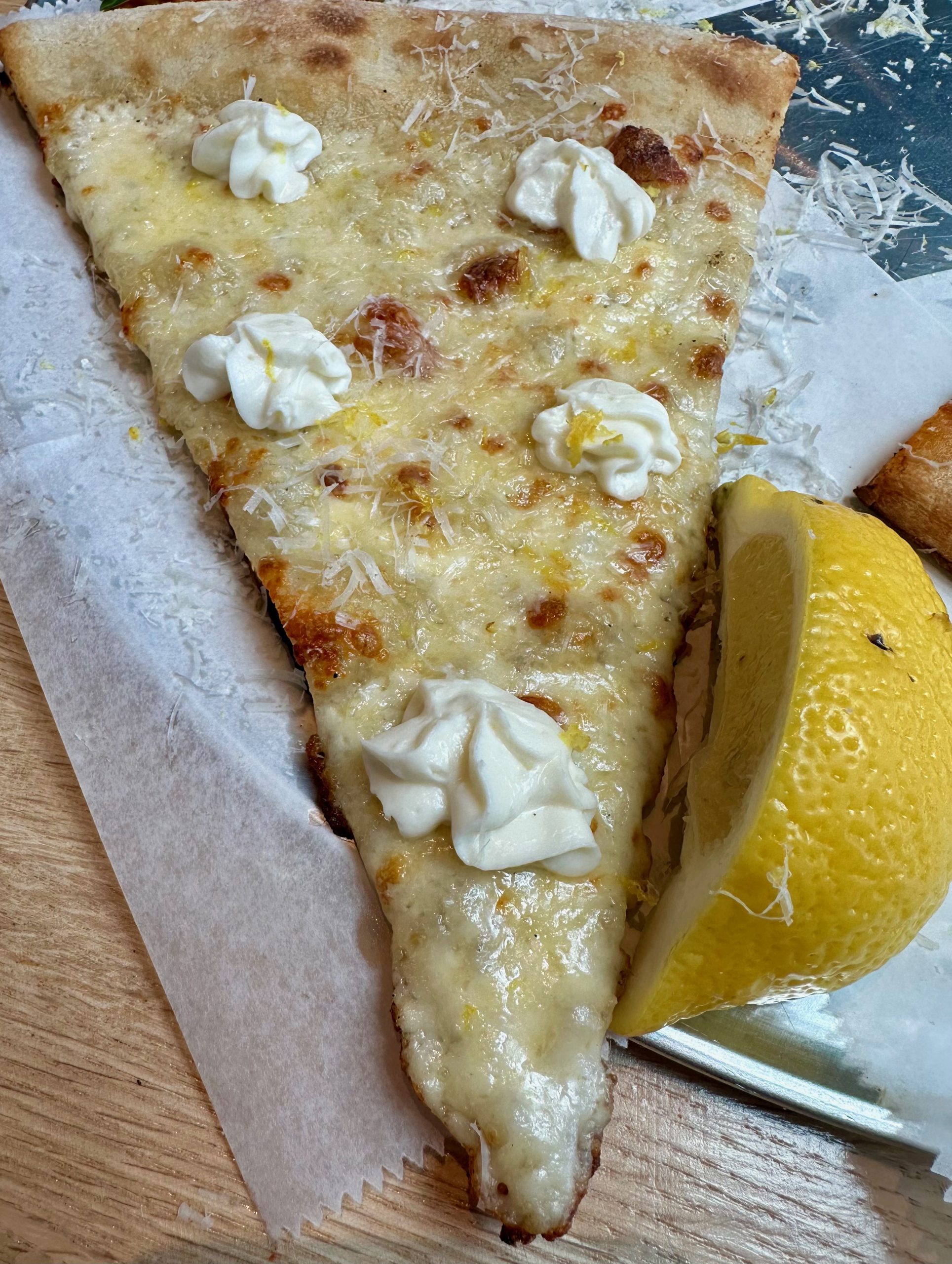 Ever since Wolfgang Puck’s signature restaurant Spago introduced the smoked salmon pizza (dill-infused crème fraîche and smoked, cured in-house salmon and a generous dollop of caviar before being finished with caramelized shallots) pizzaiolis have learned that pizza is a canvas upon which they could be creative. Most of the best examples of pizza creativity juxtopose elements of sweet and svory flavors, hot and cold and crisp and creamy. Not everyone will be ready for the White Lemon (lemon, fresh mozzarella, Fontina, whipped ricotta) which combines all those elements. It was a brave pizzaioli who first thought up this gem. Braver still would have been using a tomato-based sauce in which two acids would be paired together. Frankly, it wasn’t “lemony” enough for me. The richness, fatiness and creaminess of the cheeses seemed to devolve the sourness of the lemon. Even a squeeze or two of the lemon slice didn’t provide a deliciously discernible difference.