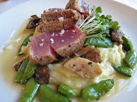 A true stand-out in the dinner menu is the seared ahi tuna with wasabi mashed potatoes, sugar snap peas, sauteed mushrooms and a sake burre blanc (an ultra-rich, buttery sauce). The sashimi grade ahi tuna is perfectly seared (the only way to truly appreciate tuna) with lightly crusted edges bordering the beautifully pink flesh. The wasabi mashed potatoes aren’t nearly as Americanized Japanese horseradish tends to be, but it certainly imbues the potatoes with a slight burning sensation. The sugar snap peas are a delight, as much fun to eat as they are delicious.