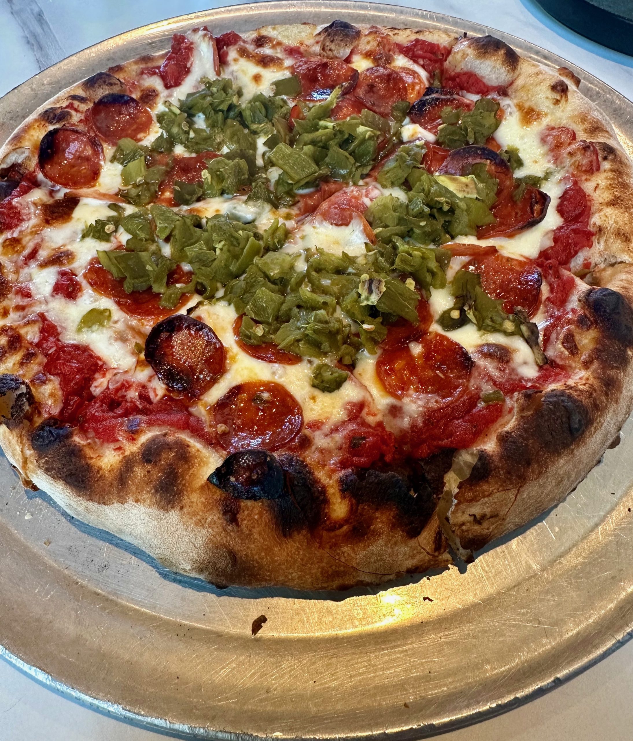 According to the SliceLife blog, the average American eats 40 pizzas per year. That’s a whoppig 6,000 slices of pizza or eight slices per month every month of your life. Every day, thirteen-percent of the population eats some form of pizza. At least in terms of pizza consumption, I’m well below average. In 2024, I’ve shared five pizzas with my Kim. Make it six. Social offers six different twelve-inch pizzas baked in a brick oven. Inasmuch as the menu didn’t offer anything unique or uniquely weird, my choice was the “Five O Five,” a pepperoni and green chile pizza. The crust is of medium thickness and has a nicely charred cornicione (outer rim of the pizza crust), what most people just call “the crust.” The cornicione isn’t covered in sauce or toppings…or even cheese. You can taste the cornicione unencumbered. Social’s cornicione tastes like bread right out of the oven. That’s a great thing. The middle section of the pizza–where the ingredients, sauce and cheese are–is also quite good. The sauce is generously applied (my preference) and quite tasty.