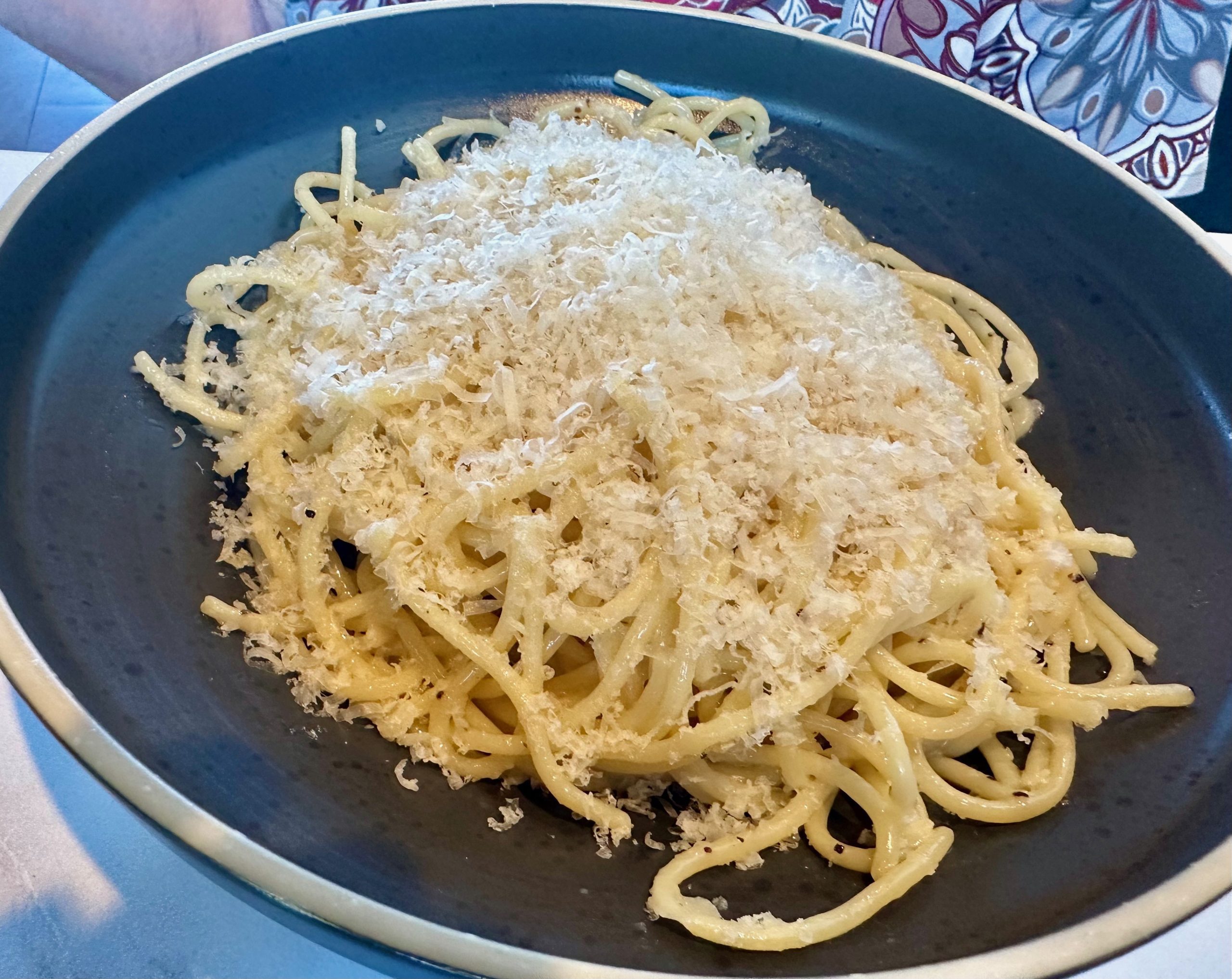 My Kim also went for Italian, albeit something pasta-based. Her choice was cacio y pepe (spaghetti, pepper, butter, Pecorino Romano). Though cacio y pepe (which translates simply to pasta and pepper) is an iconic dish of The Eternal City, it’s really only caught on across the fruited plain in the past few years. As with most trendy dishes, cacio y pepe was virtually everywhere. Though it’s a relatively simple dish, it’s not always prepared well. My preference is lots of cheese and lots of pepper (the way it’s made at M’Tucci’s. Like the stereotypical Italian, my Kim prefers an emphasis on pasta, not so much any accompanying sauces or cheeses. She enjoyed Social’s cacio y pepe very much.