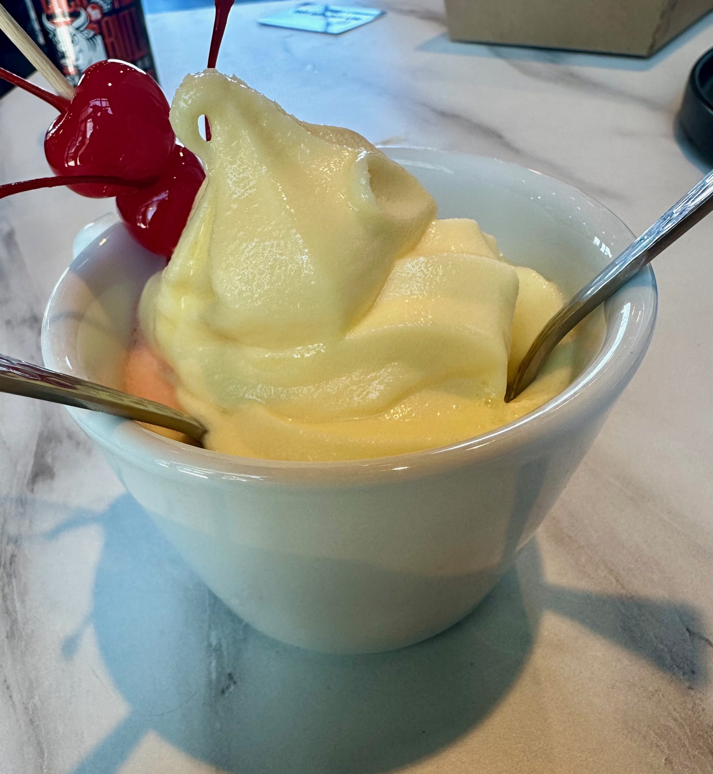 There are five desserts on the menu. In that summer has unleashed its fiery heat (usually accompanied by fierce winds), it made sense to have the most cooling dessert available. That would be the pineapple whip, a pineapple soft-serve. My Kim let me have the three cherries impaled on a plastic sword, but the pineapple whip was hers alone. She called it refreshing and delicious, a perfect balm for a sweltering summer day.