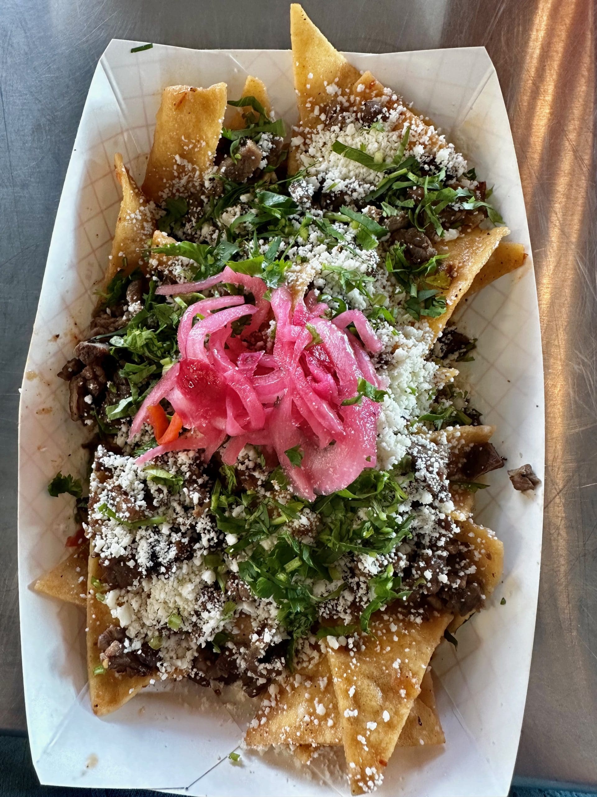 8 June 2024: As we perused the menu, Fernando made an audacious statement in declaring the chilaquiles the best we’ll ever have. They’re not New Mexican chilaquiles,” he explained, “they’re Mexican and you’ll love them.” Usually only politicians make such bold proclamations and they usually wind up being fabrications. Not so at Rio Tacos. The chilaquiles were outstanding without being overly complex. They were constructed with a paper bowlful of creamy salsa chips topped with cilantro, pickled onions, shredded pork (or another protein of your choice) and cotija cheese topped with a mild avocado salsa.