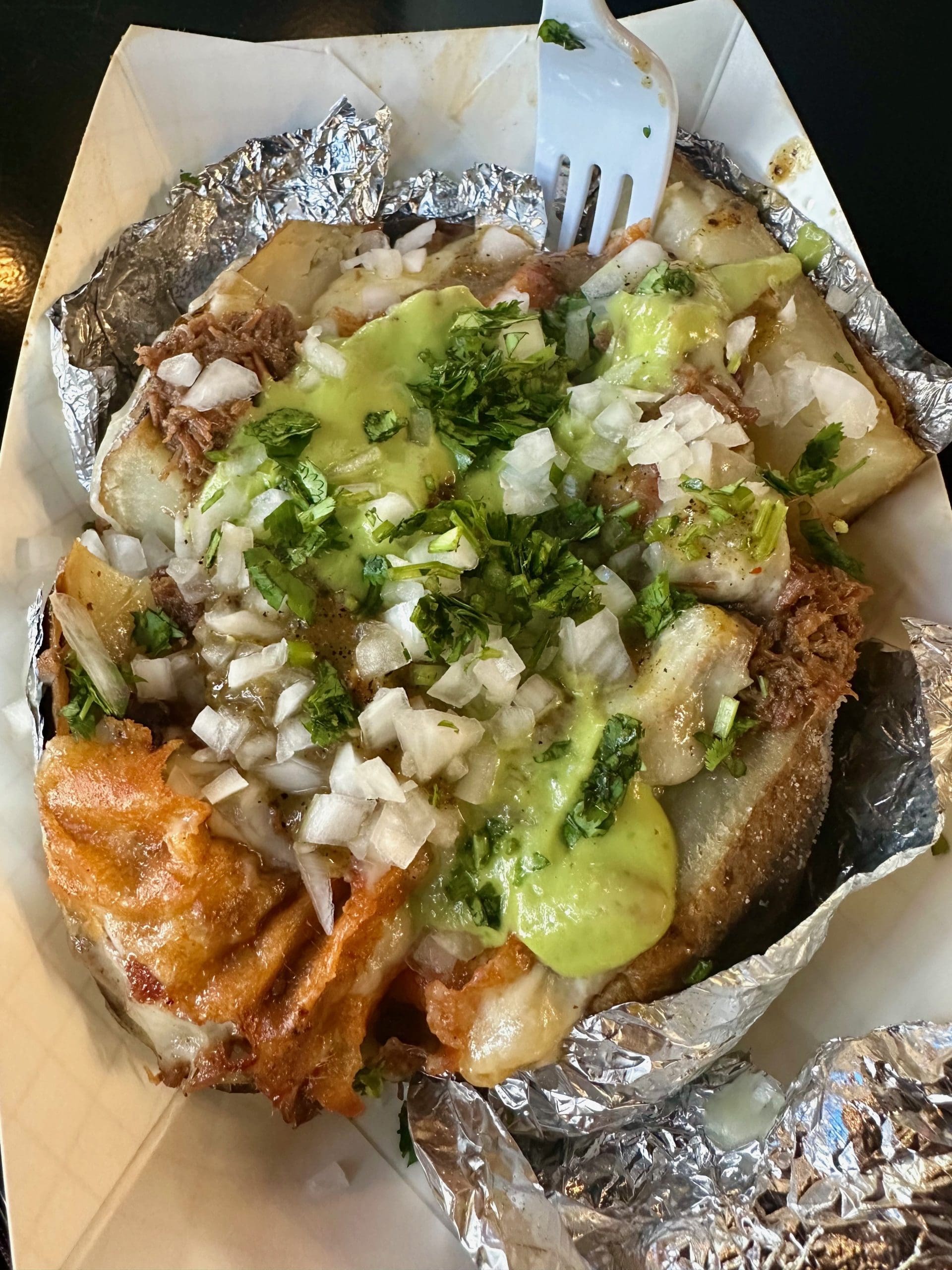 Could it be the ingredients with which Mexican baked potatoes are stuffed so generously? At Rio Tacos, a football-sized stuffed baked potato is stuffed with butter, cheese, cilantro, onion, salsa and your choice of protein. When constructed with all these toppings, the baked potato is more than meal-sized. It’s humongous. Rio Tacos doesn’t top your potato with the usual shredded Cheddar. They use Monterey Jack, a sweet and mild cheese that melts well. On your baked potato and other menu items, the cheese is melted into a “frico” (crispy melted cheese) skirt that’s fun to eat. It’s Fernando’s favorite cheese. Barbacoa is an outstanding protein on the potato, lending its sweet and rich meatiness to every bite.