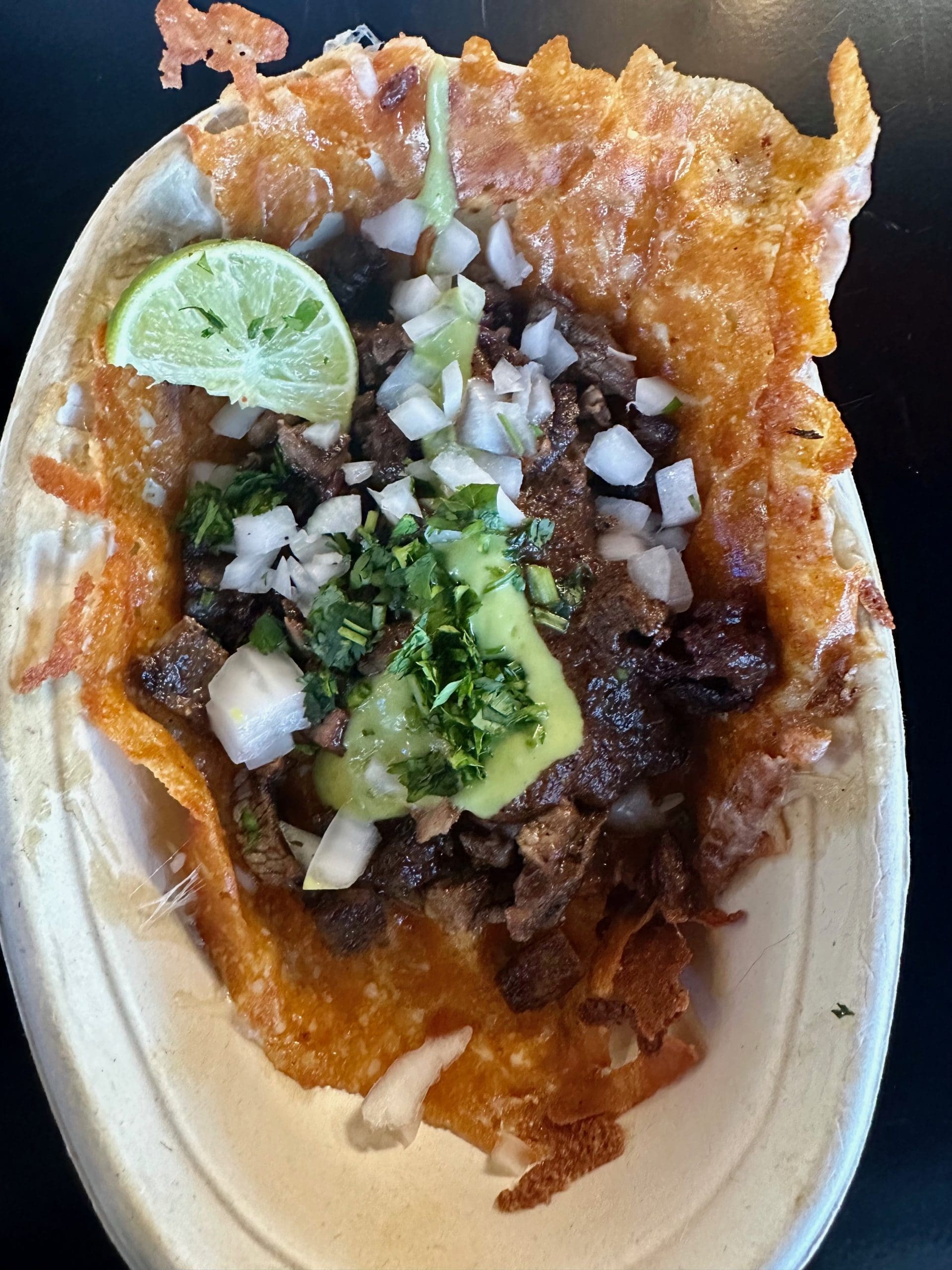 12 June 2024: More than any restaurant we’ve visited, Rio Tacos showcases crispy cheese skirts as a platform for other ingredients. One example is an entree called “Crusted Quesadillas.” Crusted Quesadillas–that’s not the entirety of its name. There are five crusted quesadillas, made with the aforementioned proteins. The Crusted is akin to an open-faced taco. At the very bottom (the canvas upon which the open-faced taco is made) is one of Rio Tacos’ housemade tortillas covered in a crispy cheese skirt. On top of that are onions, cilantro, avocado salsa and a lime. Texturally, that crispy cheese skirt is an absolute delight though you probably have to be a turophile (connoisseur of cheese) to like it as much as I did. Obviously the crispiness prevents you from folding the “Crusted” like a taco. Instead you’ll eat it like a slice of pizza. You’ll love eating it.