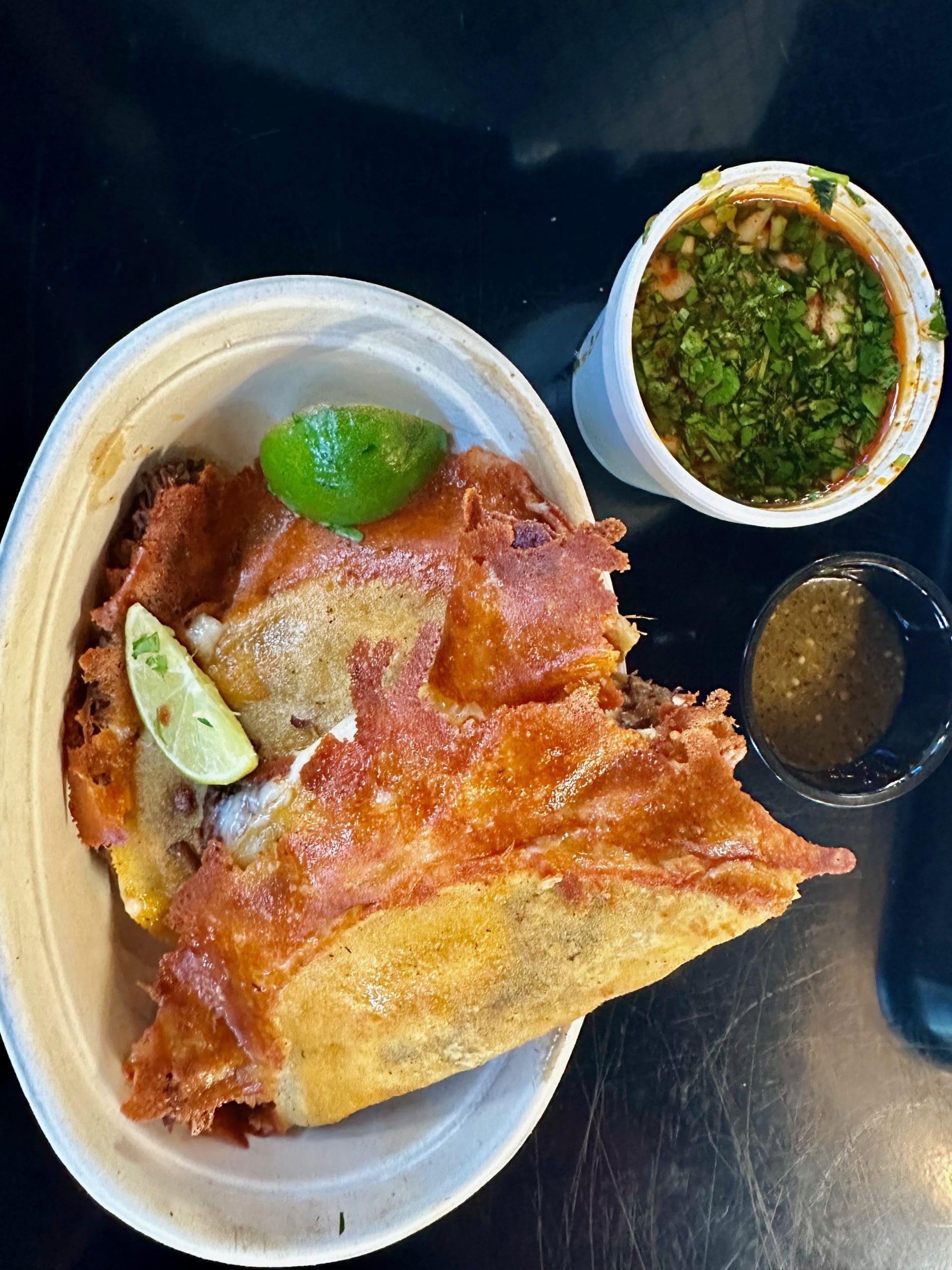 12 June 2024: Bruce Terzes, my Corrales connection, sure knows how to torture me. Instead of sending me a photo depicting quesabirria tacos in all their glory, he sent me a photo of an empty plate after he had devoured three quesabirria tacos at Rio Tacos. If his intention was to motivate me to finish my long overdue review of his favorite taqueria, he was successful. If you’ve already had nearly every single quesabirria plate in the Albuquerque, you owe it to yourself to try Rio Tacos version. One of the things that makes it distinctive is just how prominent the cheese “skirt” is. That cheese is caramelized to the point where it extends far beyond the corn tortilla. If you love crispy cheese, you’ll love the cheese skirt. Once you get past that skirt, it’s all moist beefiness. The accompanying consomme is aromatic and delicious, a wonderful dipping sauce for a superb quesabirria taco.