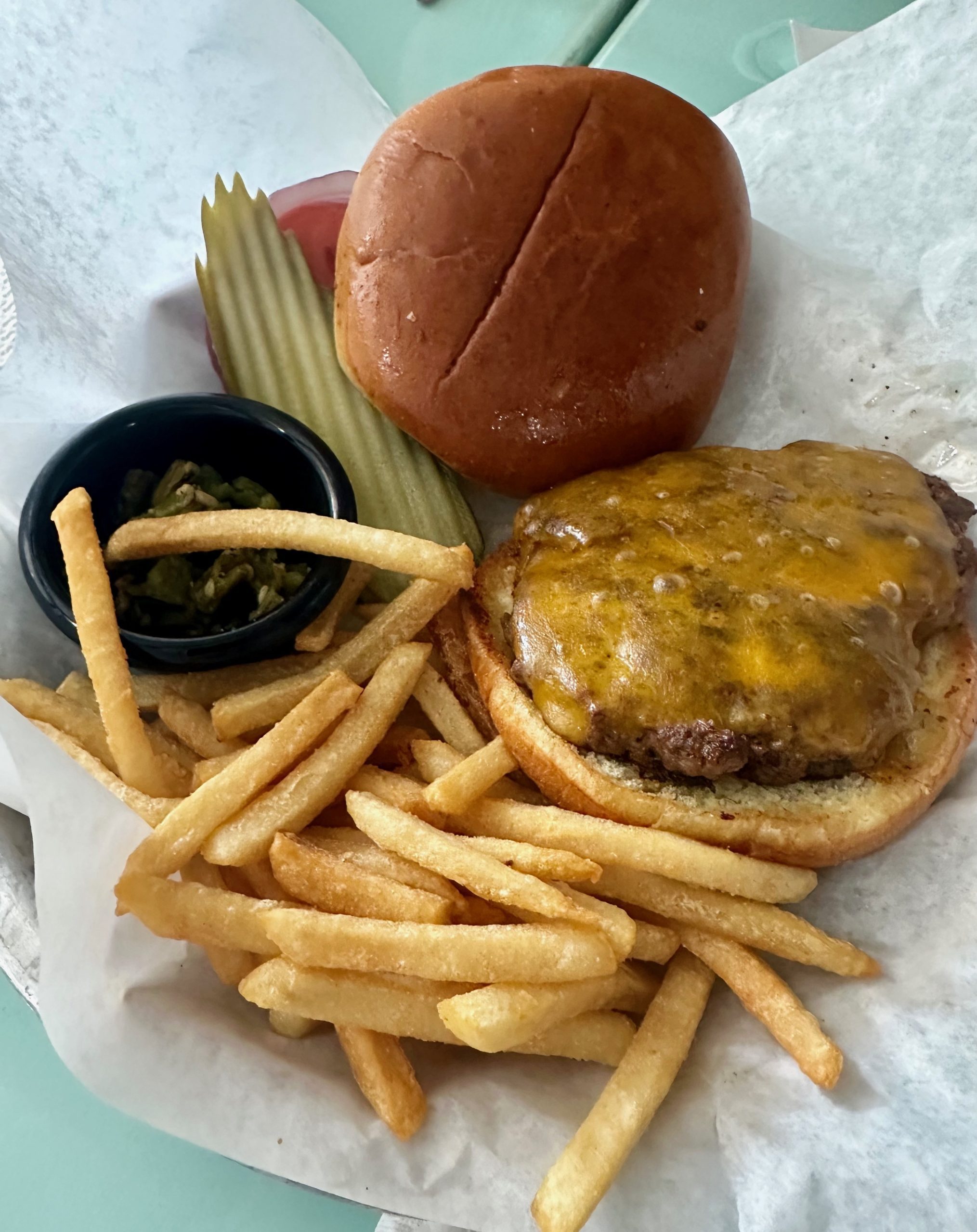 So, what prompted the “would have, could have, should have” diatribe with which I started this review? Those three terms pretty much define and describe my entree, a smothered tortilla burger (green chile cheeseburger wrapped in a flour tortilla, smothered with red or green chile (I had both), topped with lettuce, tomatoes, onions and French fries. Seriously, it’s a burger that could have been great. It should have been great! Only one thing prevented it from being great, but it’s the one thing that matters most on any burger. The beef patty was incinerated–nearly charcoal-like. There was nary any hint of moistness. I should have, could have and would have sent it back, but with only one enthusiastic server trying to take care of a roomful of guests, it would have taken more time than we wanted to invest.