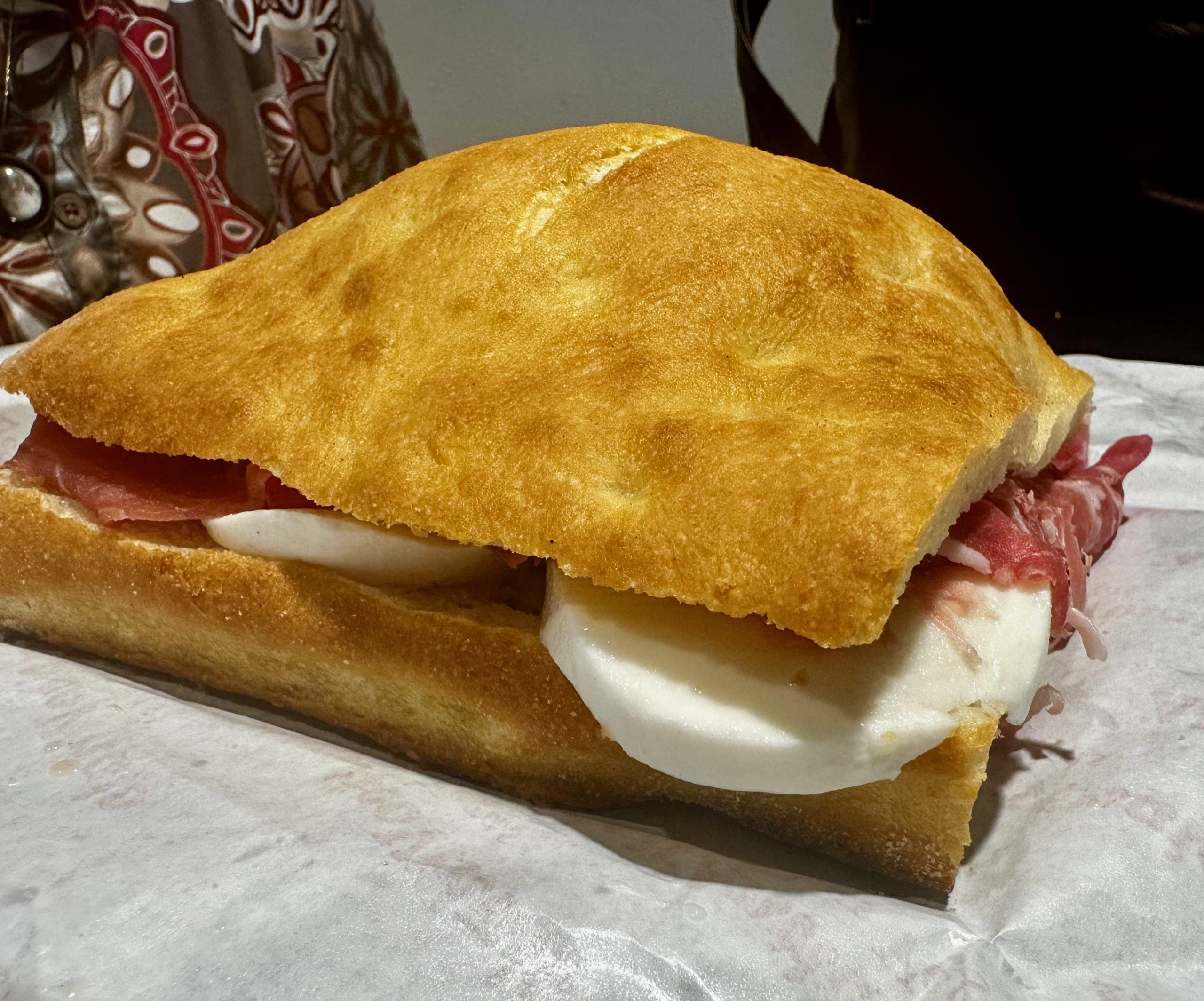 Perhaps what distinguishes sandwiches at all’Antico Vinaio from all other sandwiches is schiacciata (which means “squished” as in with fingertips). Each sandwich is constructed on this magnificent Tuscan bread, a (“cousin of focaccia,” but much better). It takes two hands to handle each sandwich which our servers were unable to cut in half for us because they don’t keep cutlery in the restaurant. I pried my eyes from the deli counter only when a baker emerged from the back with stacks of schiacciata, each loaf shimmering with olive oil and coarse salt. As each loaf is sliced horizontally, clouds of steam waft upwards to the delight of our olfactory senses.