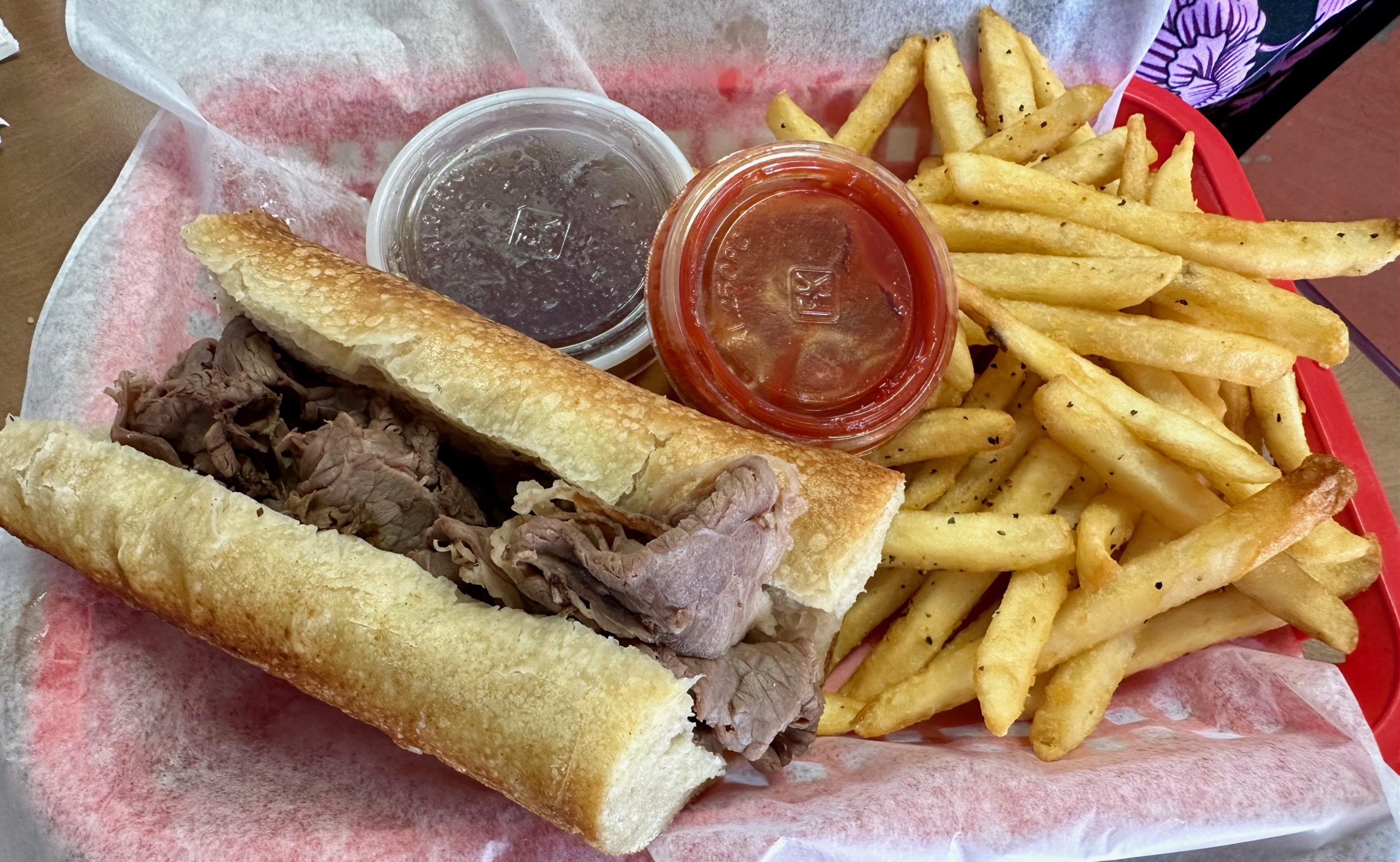 23 August 2024: For my Chicago born-and-bred bride, no sandwich menu is complete unless it offers an Italian beef sandwich. To denizens of the Windy City, Italian beef sandwiches are on par with Da Bears. They’re an institution recently made known to the rest of the world by FX Network’s “The Bear.” Sergio’s Italian beef sandwich (beef soaked with gravy, hot peppers and Cheez Whiz) on a baguette has all the essential elements though Cheez Whiz is a Philadelphia affectation never found on true Chicago Italian beef. My Kim ordered her sandwich sans that processed cheese sauce and hot peppers) and asked that her sandwich be dipped in the gravy. Her verdict–authentic enough to please a Chicago gal. That means tender tendrils of moist beef seasoned with plenty of oregano and served with au jus on the side. I liked it, too, though would have preferred it with hot peppers.