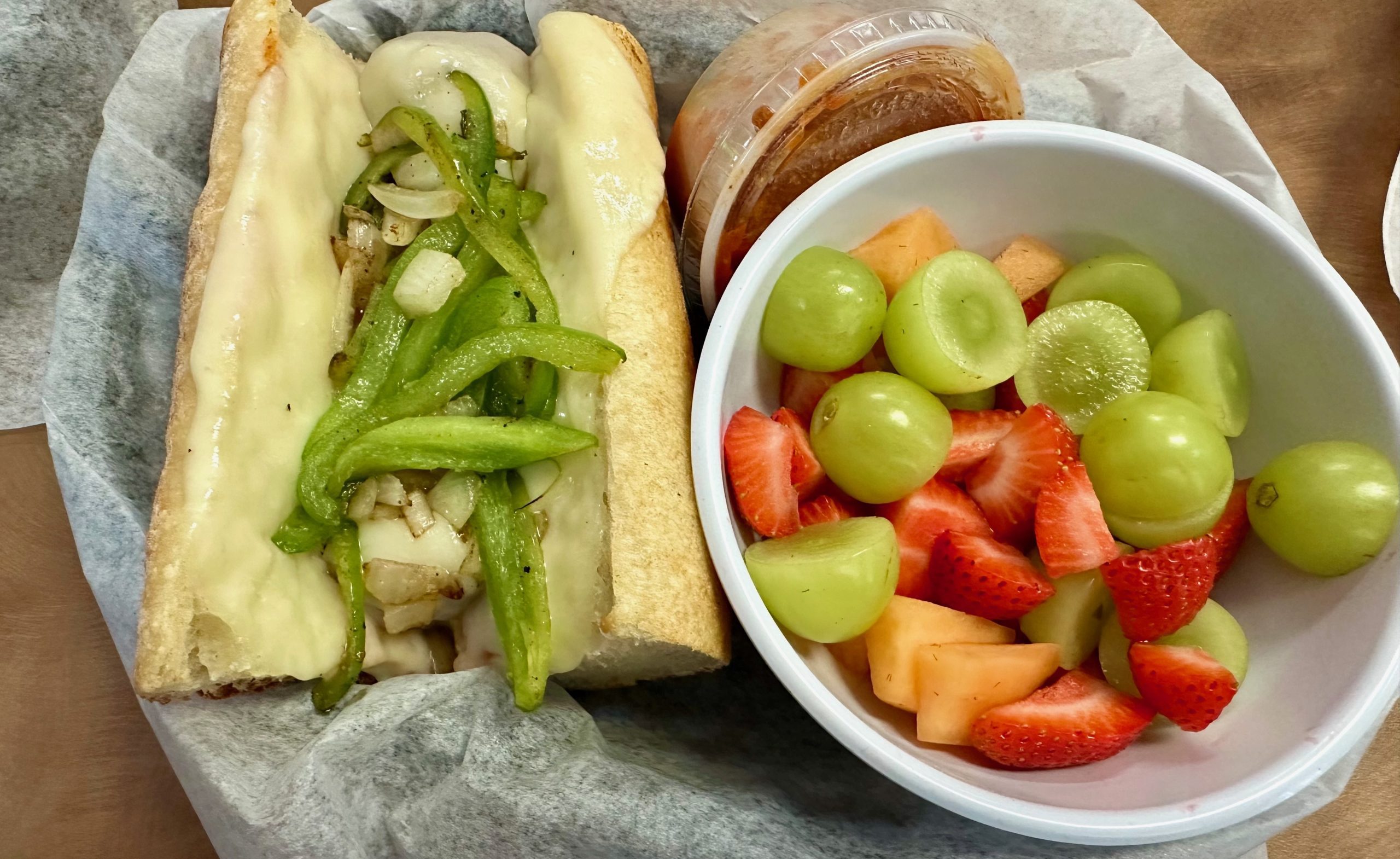 23 August 2024: Our friend Lynn has often lamented not finding a good meatball sub anywhere in Albuquerque. For any of us who have lived on the East Coast, that’s a common complaint. Throughout the East Coast, meatball subs are roughly the size of a baseball and they’re drenched in a red sauce (gravy, if you will) as wondrous as ambrosia was to the gods of Olympus. Sergio’s offers Momma’s Meatball or Sausage (Provolone, peppers and onion on a baguette). As the photo above will attest, the meatballs are tiny and obscured by the cheese and onions (until you bite into the sandwich and sauce explodes out). Marinara sauce is provided on the side for dipping. The highlight of this sandwich is the bread, a soft and chewy canvas that makes a great home for any sandwich.