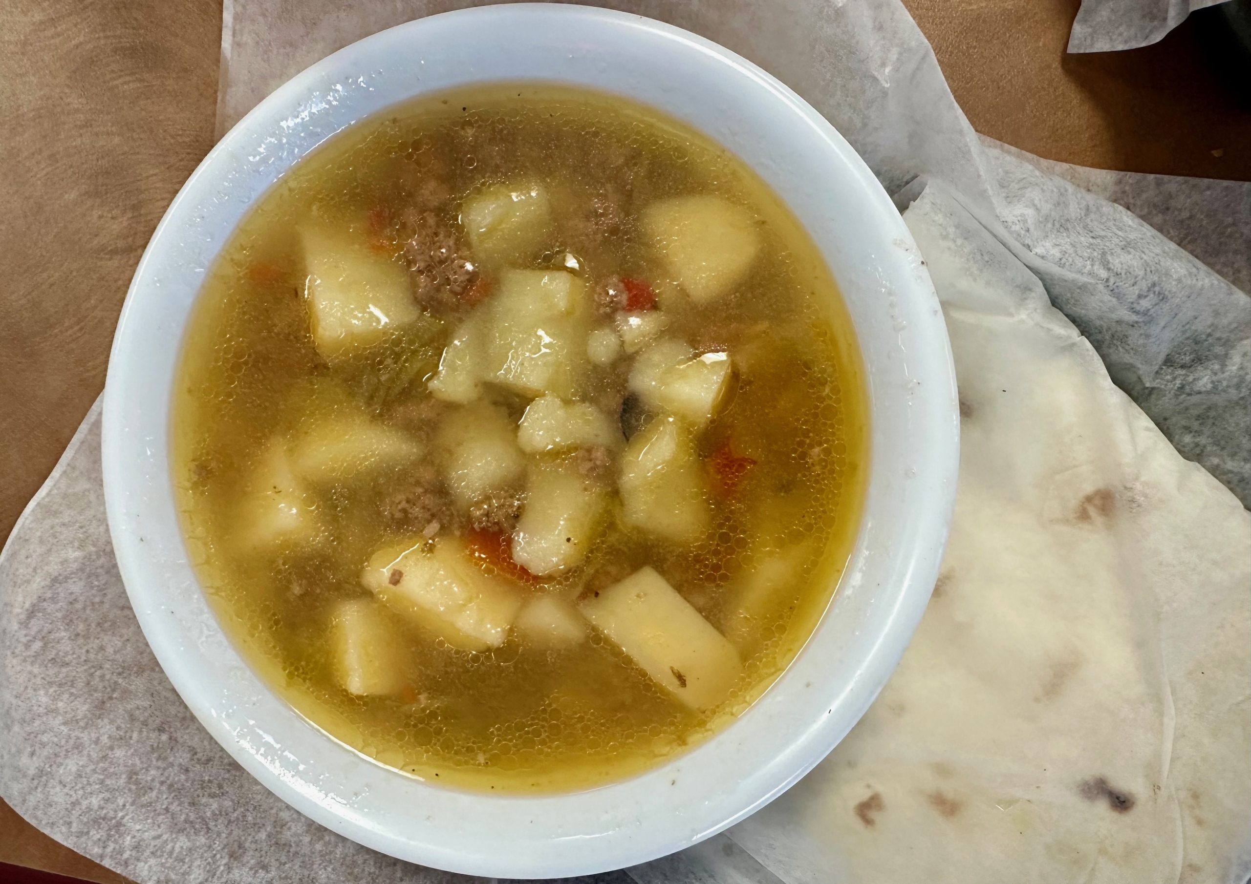 23 August 2024: Sergio’s offers something bakeries in Italy don’t have. That’s loaves of bread baked with green or red chile. Also on Sergio’s menu is a green chile stew (potatoes, ground beef, carrots) even native New Mexicans (being one of them, I know) will love. After not being able to finish my portion, our gracious server filled a to-go cup, giving me a very nice dinner. This green chile stew isn’t particularly piquant, but it’s got that inimitable aroma roasted green chile offers.