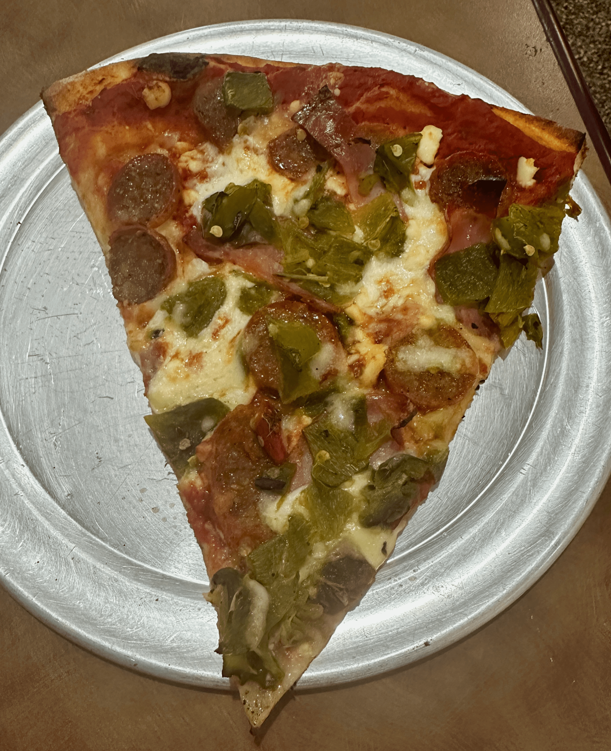 6 June 2025: It’s always made sense to me that great bakers should be able to bake the very best pizza you can find. After all, a great bread is the canvas upon which ingredients are placed. Pratt and Chris Morales at Golden Crown Panaderia certainly validate my contention. So do the great bakers at Sergio’s. Though we had often espied pizzas being delivered to tables throughout Sergio’s, my inaugural pizza was in the form of a slice. No ordinary slice was this. A golden crust speckled with light char was topped with sausage, ham and green chile. The green chile was eye-opening with a potent piquancy New Mexicans can respect. The slice was thin, especially where it tapers to a fine point. You’ll need your fork for about a fourth of the slice, but after that you’ll enjoy picking it up and eating it the way pizza is meant to be enjoyed.