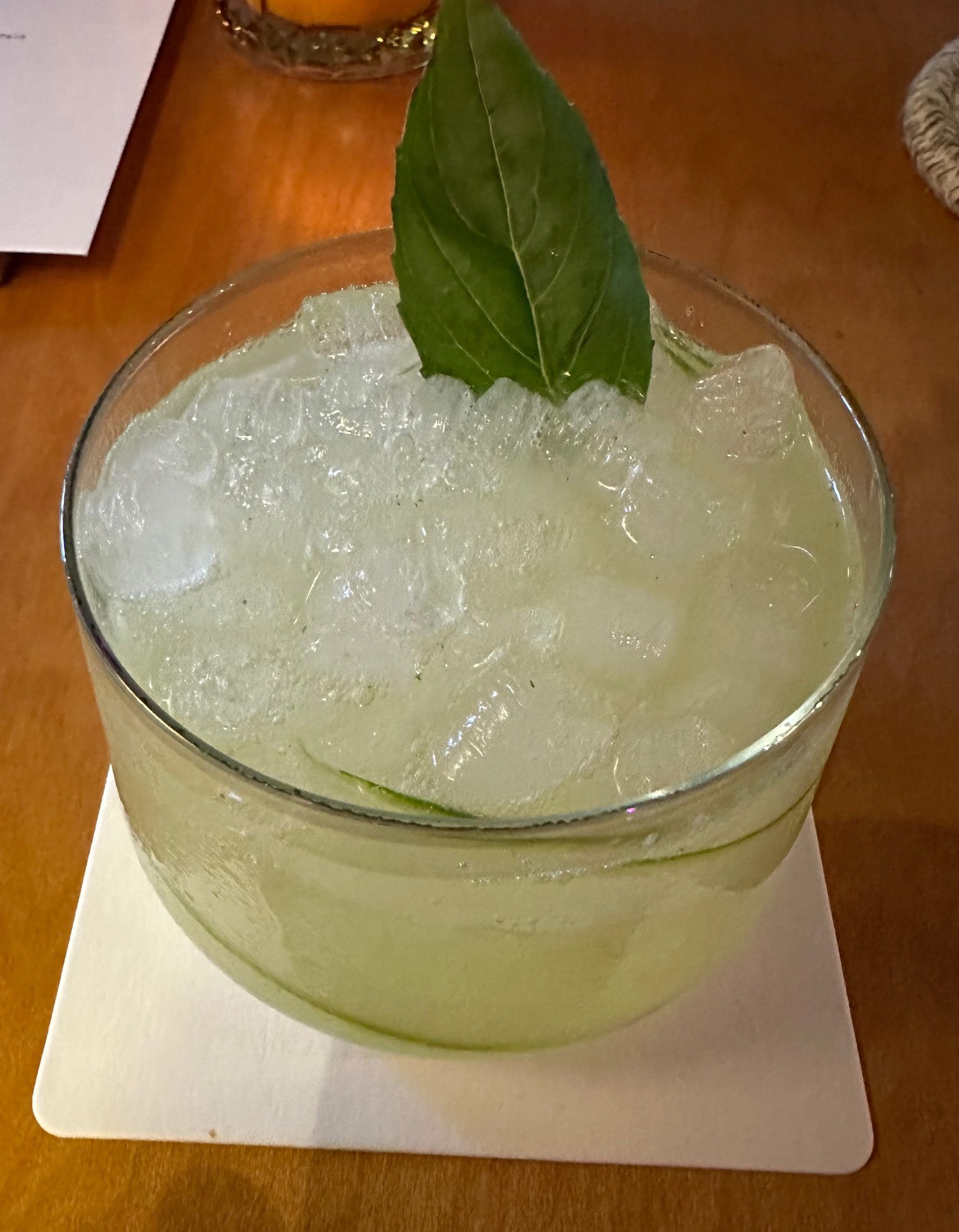 My first non-alcoholic beverage was a sandita fresca (watermelon rind, green apple, cucumber, basil, lemon), a blend of fruits with one herb (aromatic basil) and cucumber, which is technically both a fruit and a vegetable. This refreshing beverage is named for sandita, (also known as little watermelon, mouse melon, Mexican sour gerkin, or cucamelon), a crunchy slightly sour cucumber hailing from Central and South America. There is alchemy in this beverage, a magic that will delight your taste buds as it cools and refreshes you. Somewhat resembling Mountain Dew, it’s the first of four wondrous beverages that I would make reservations to enjoy.
