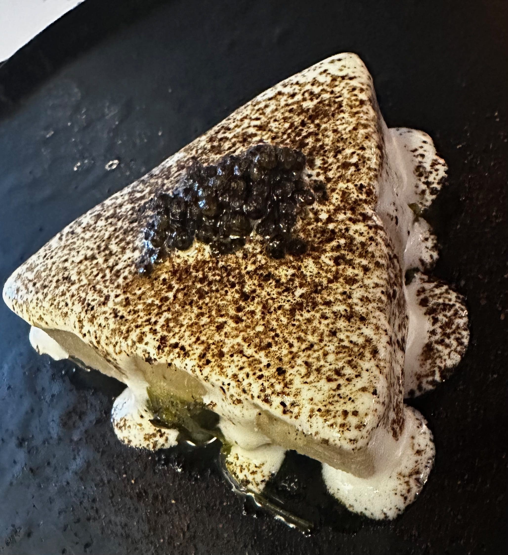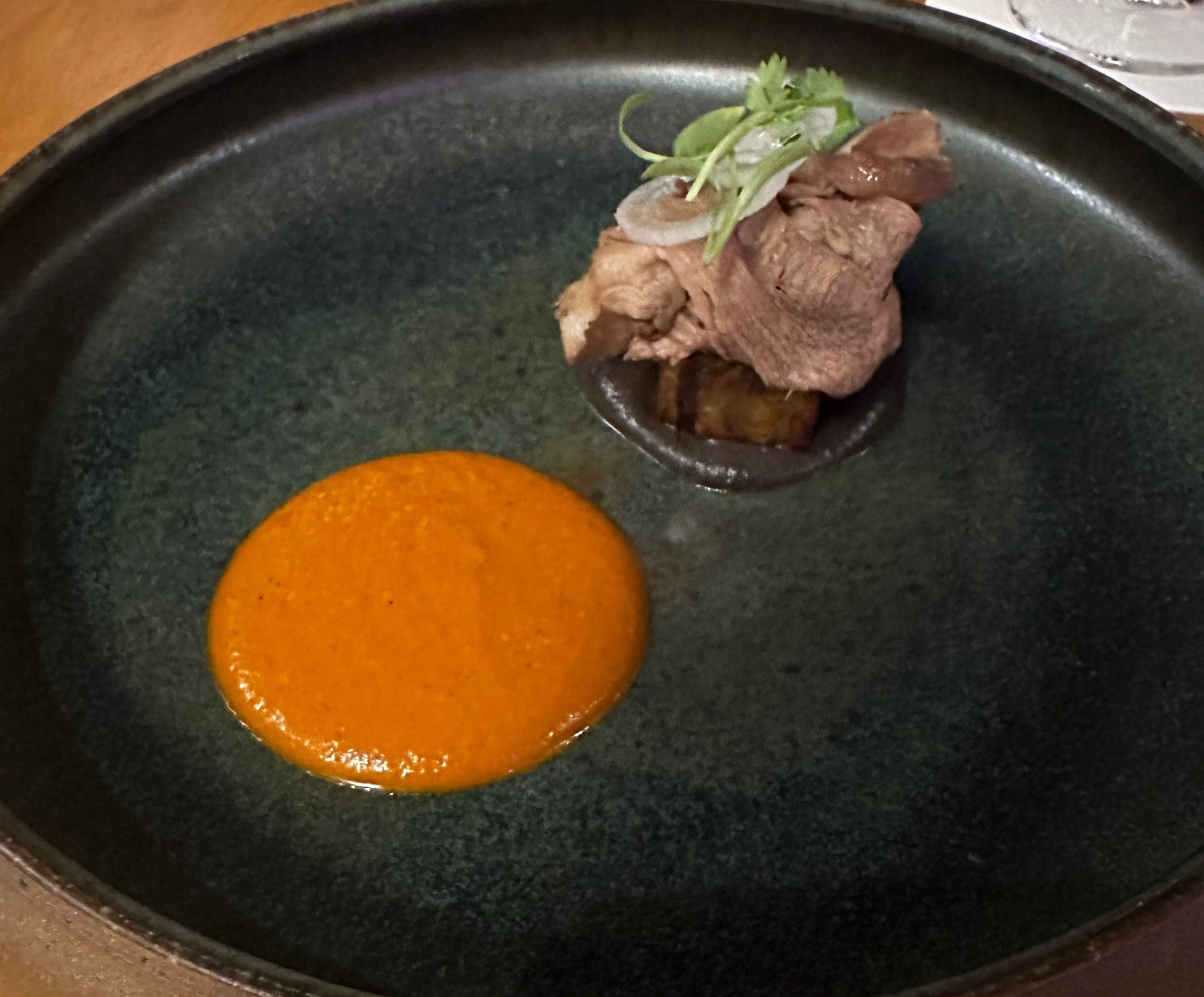 Next along the culinary cavalcade was corunda (white corn, rajas, koji jocoque) a traditional Mexican tamale that originated in the pre-Hispanic period in the state of Michoacán. Corundas are usually triangular or spherical in shape and are often eaten with sour cream and red salsa. Mixtli’s rendition is made from white corn enveloping rajas (strips of vegetables) and topped with jocoque, a creamy, slightly sour dip somewhat resembling Lebanese labneh, a yogurt cheese made by draining yogurt twice. A dollop of caviar crowns the corunda. Needless to say, it’s the best tamale I’ve ever had and I’ve had hundreds of them. (My friend Melinda Martinez tells me her brother Chris Guardiola makes the best tamales in Texas, but I have yet to try them.)