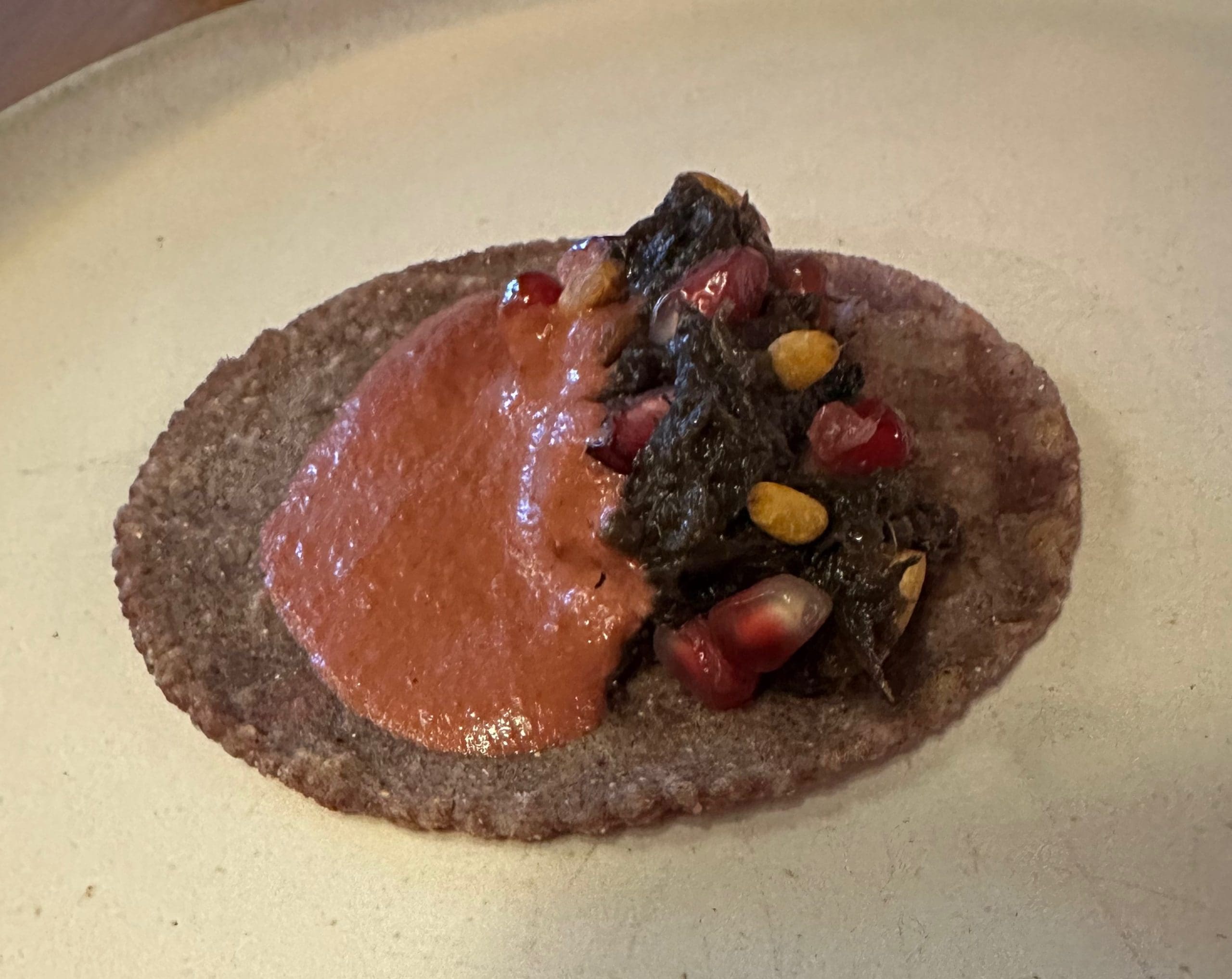 Each dish delivered to my table prompted delberation: “How could Mixtli possibly top this?”. That was my reaction even before having tried the mole rosa (roasted beets, smoked hibiscus, pomegranate) which looked like one of those “worth a thousand words” images now permantly enscribed on my mind. Now I can say I visited San Antonio and had the very best taco offered in a state renowned for its tacos. The mole rosa acquired its distinctive color from beets and was served atop a blue-corn taco gently carressing smoked and shredded hibiscus with a smattering of pomegranate seeds. I’ve had mole rojo many times, but never before mole rosa. Mole is an amalgam of ingredients working concordantly together. The mole rosa played a symphonic opera on my taste buds.