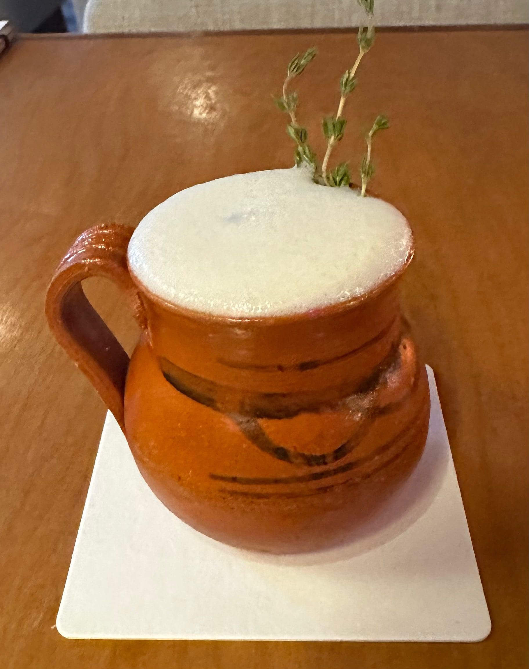 Were it not for Mixtli’s version of horchata, the Michoacan thyme (mango, thyme, lime, honey-coconut foam) would have been my favorite among the beverages. Served on a distressed clay mug seemingly more appropriate for a hot beverage, it even resembled steaming coffee courtesy of the honey-coconut foam. From among all the beverages served, this may have been the most complex–or at least it had the most going on in terms of different notes making love to different parts of my palate. When the liquid portion was but a memory, I savored the thyme, reminding me why thyme is one of my favorite culinary herbs. I may have to move to Mexico to have Michoacan thyme again.