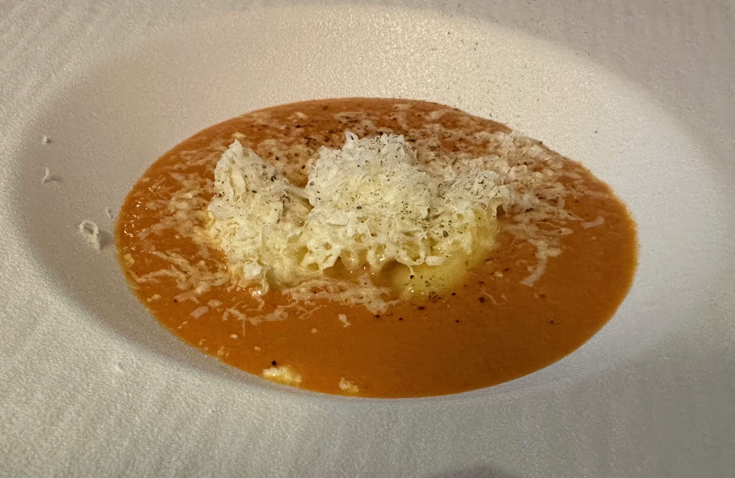 As an avowed teetotaler, my (small) disappointment at Mixtli not offering Big Red quickly abated when Laura told me about Mixtli’s bar program. That program includes a panoply of non-alcoholic beverages for those of us who don’t imbibe the “adult” stuff. Each non-alcoholic beverage showcases Laura’s immense talent and creativity. Like the restaurant’s cuisine, the bar program offers a variety of cocktails rooted in the history and romance of Mexican lore . Whether it be wine, spirits, cocktails or mocktails, you’re in for a treat. While seated at the bar, my first course arrived. The corn esquites tart (charanda, tepache foam) was a one-bite masterpiece of deliciousness, so sublime I wanted a platter of ten. Laura explained that charanda is typically a Mexican spirit made from sugarcane, but she doesn’t allow it to ferment long enough to become alcohol. Similarly tepache is made by fermenting fruit skins with piloncillo, spices and water. Apparently I was so eager to try my hand at imitating Guy Fieri, (he of the Jaws one-bite mouth) that I forgot to photograph one of the best first courses you’ll find anywhere.