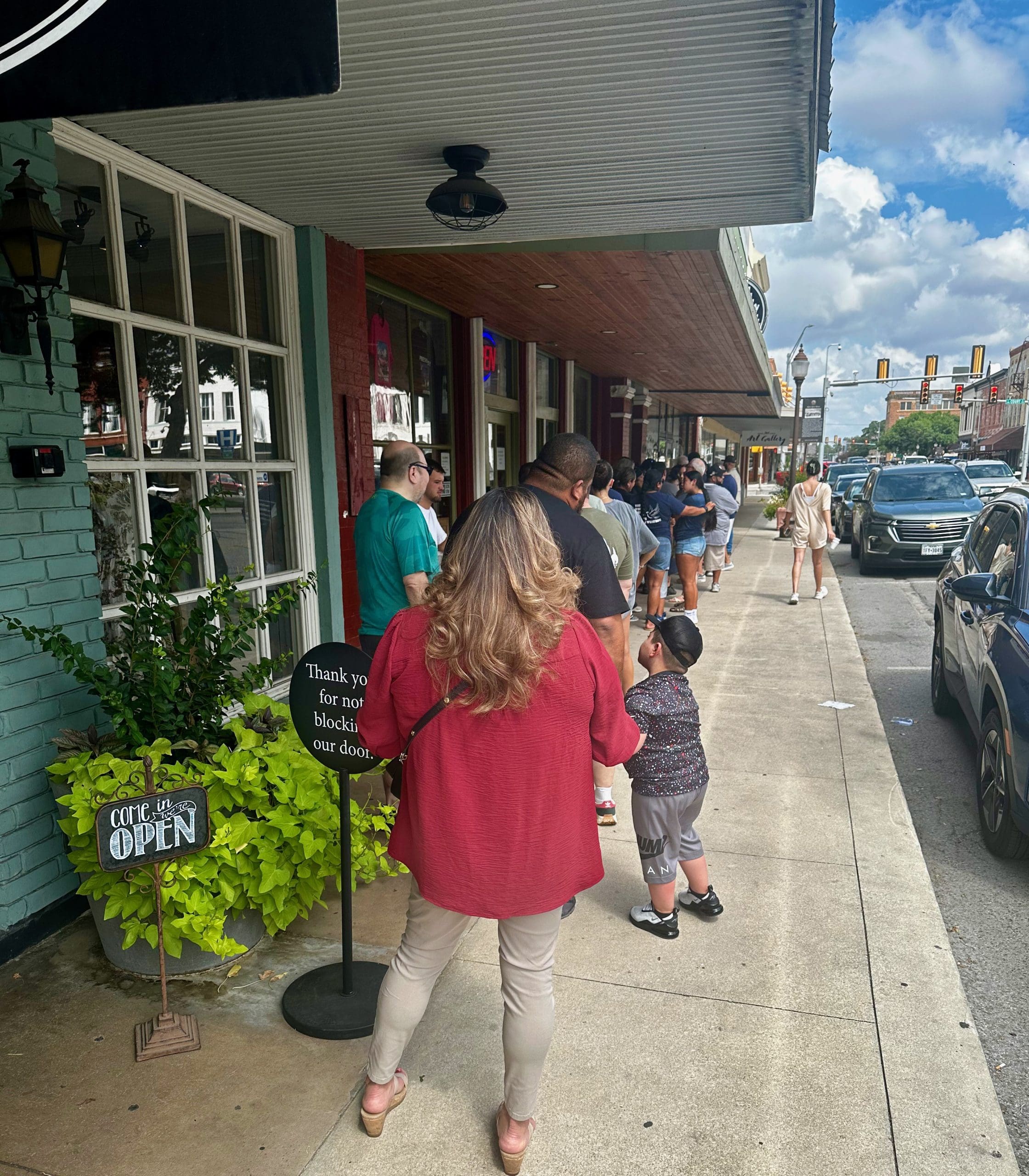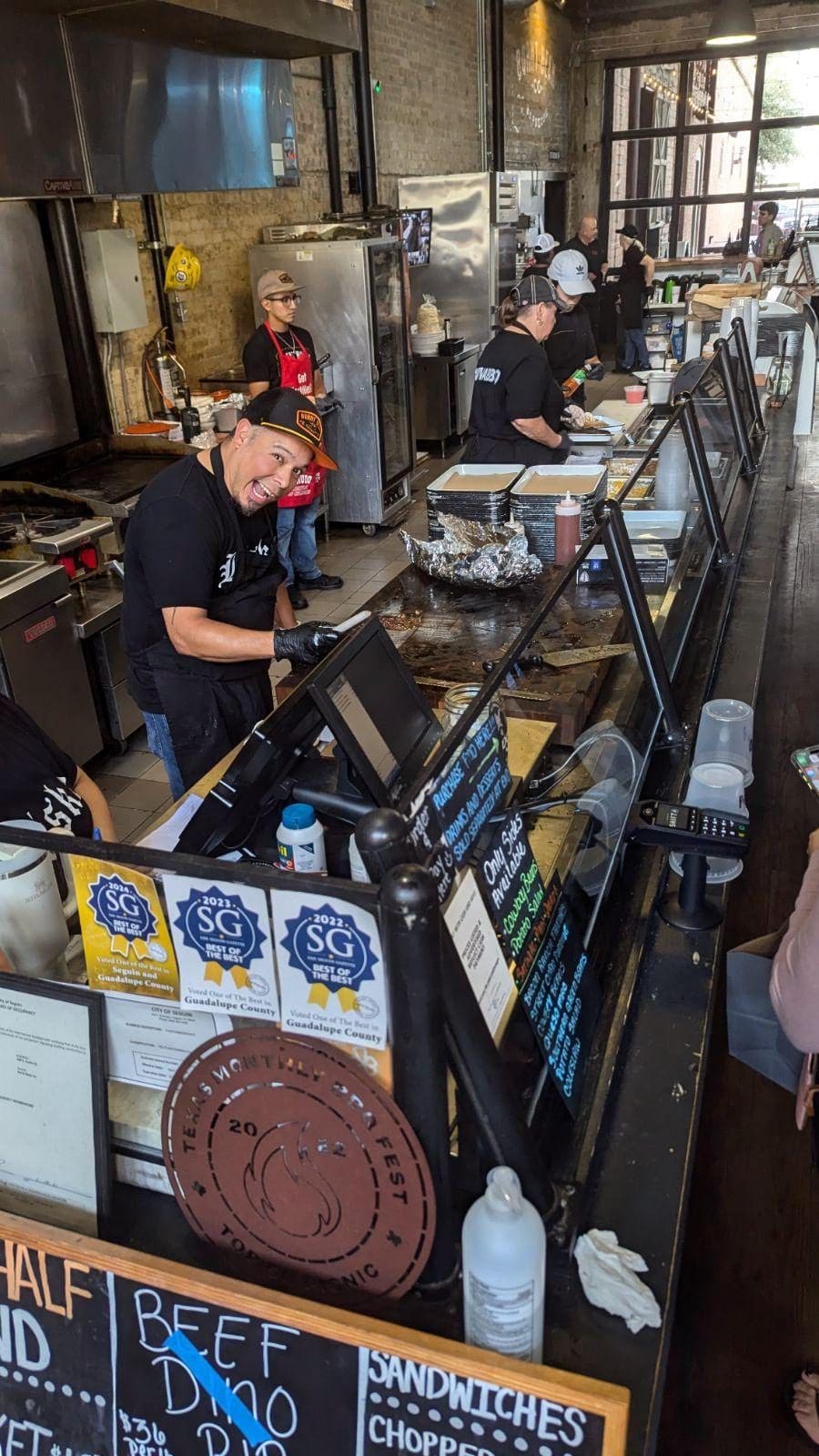 Despite catching a 5:30AM flight from Albuqurque, I didn’t reach Burnt Bean until a couple minutes before noon. Research had told me many of the items on the fabled Sunday breakfast would be gone by the time my place in the serpentine queue reached nirvana. Fortunately, a very comely woman named Melinda Martinez was in line just ahead of me. We hit it off right away, making time in line go much faster than it otherwise would have. Two years ago, Melinda moved to Seguin from Lockhart, Texas, the undisputed barbecue capital of Texas. It was her first visit to Burnt Bean. Like me, she was hoping to partake of Burnt Beans amped up version of huevos rancheros, a creation that includes barbacoa, brisket, refried beans and more ingredients that make this breakfast dish the best part of waking up.