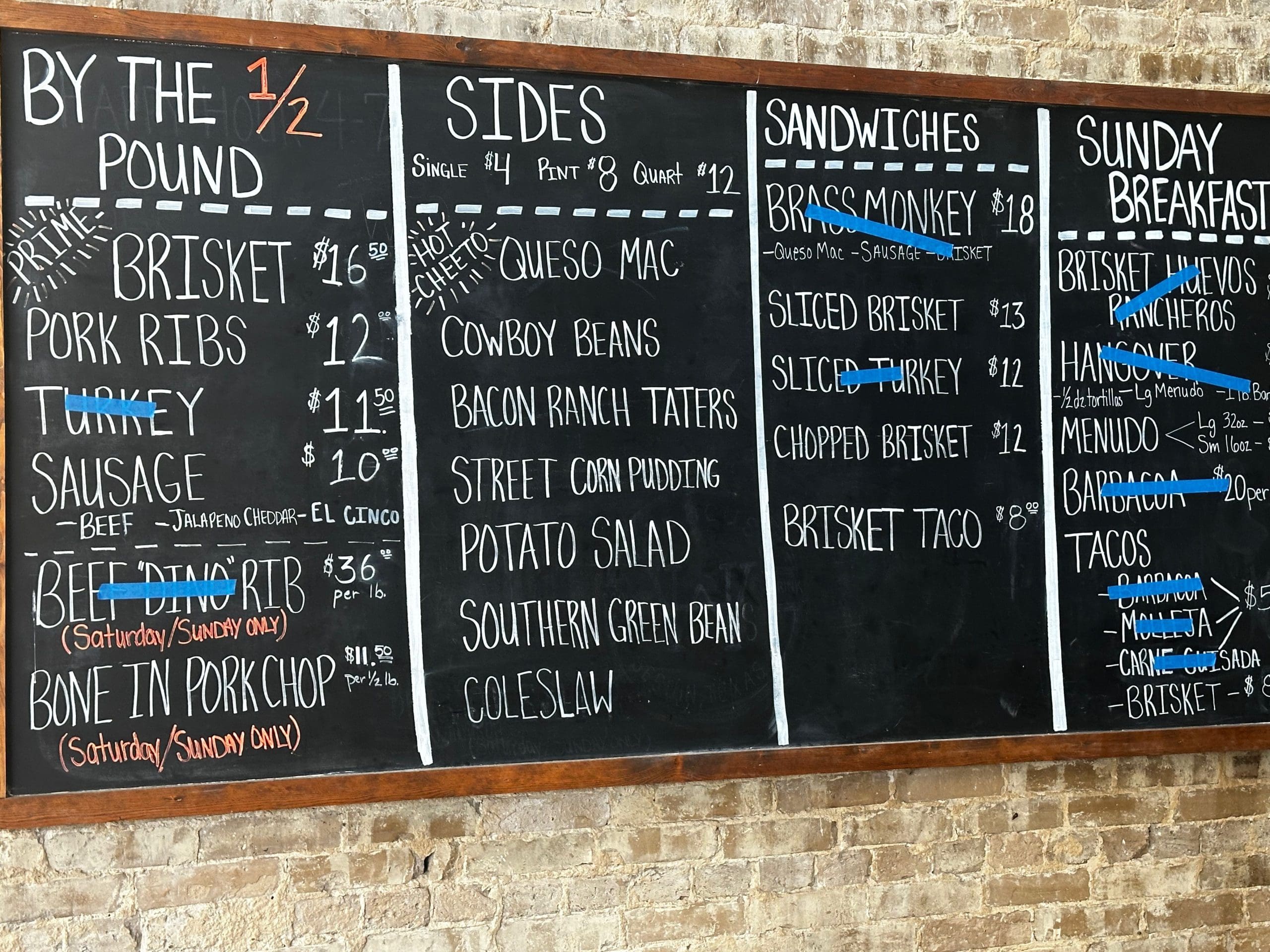 Making your way to the front of Burnt Bean’s hallowed front door is akin to winning a lottery. That thrill is dashed somewhat when you espy the slateboard menu with several items scratched off. The restaurant had not only run out of “The Cassanova” (the aforementioned huevos rancheros), but the Beef “Dino” Rib, a whopping $36 per pound. Three–barbacoa, molleja, carne guisada–of the Sunday breakfast menu tacos were also gone as was turkey. It’s hard not to think you’re settling for Miss Congeniality when all your preferred choices are gone and you have to settle for something else, but there’s just so many intriguing items on the menu that you’re inevitably going to find something to love. In Melinda, I found someone after my own heart. She contemplated the merits and virtues of every item, approaching her ordering process methodically.