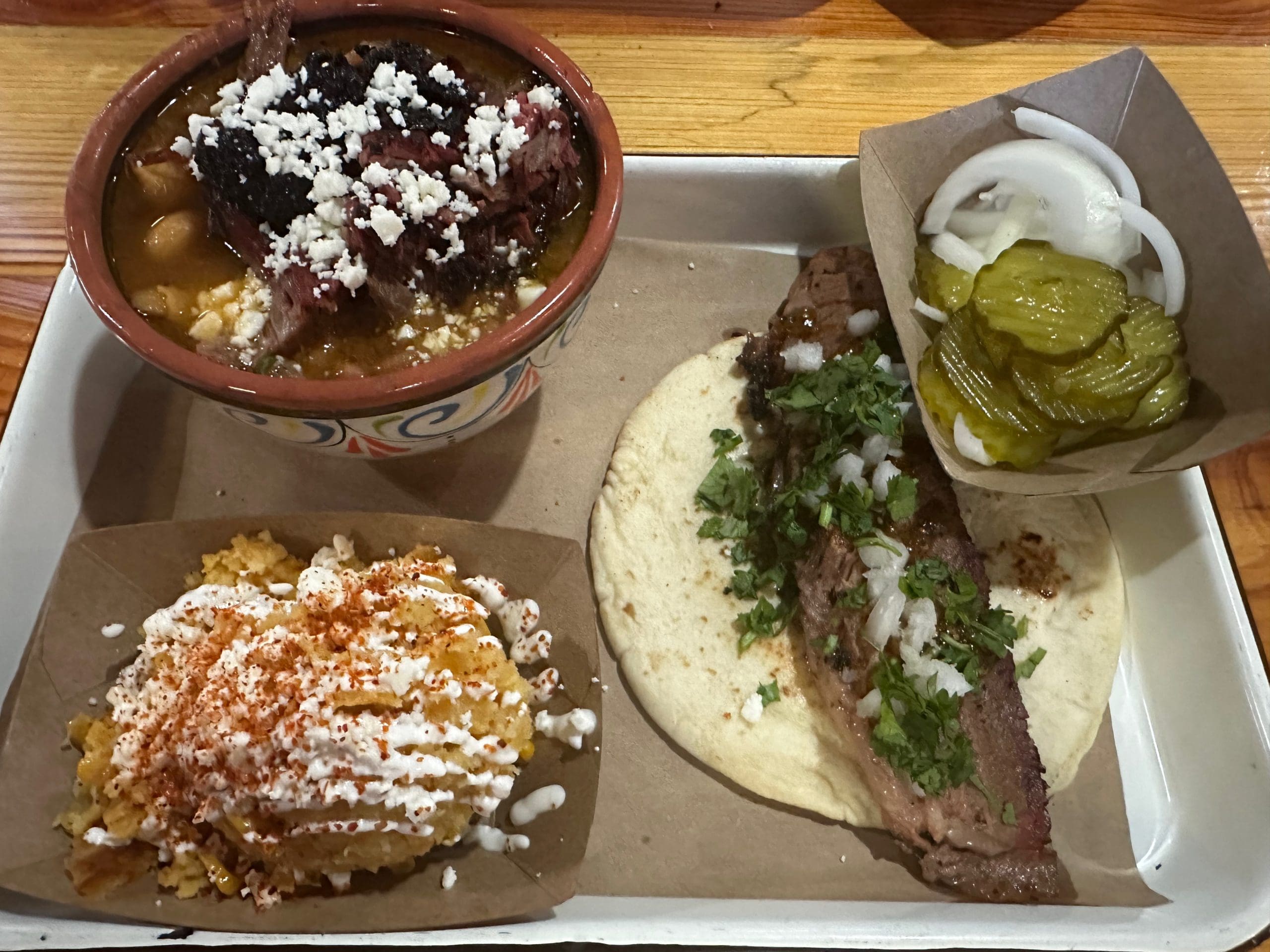 We eventually made it through the queue inside the restaurant. At the station where you place your food order, we got to watch as a deft knife-handler sliced tender, glistening brisket into whisper-thin shards for the brisket tacos both Melinda and I ordered. We watched the construction of a conchita bowl (cowboy beans, conchitas, chopped brisket, queso fresco, pickled jalapeño). Melinda had to educate me that a conchita is not a Mexican sweet roll that resembles a seashell. Conchitas are a pasta shaped like seashells. Our server also put together the intriguing street corn pudding (sometimes called pan de elote). It’s a large scoop of buttery corn cake which straddles the line between a warm corn pudding and cornbread perfectly. Chef Servantes has decribed it as “It’s like Mexican street corn and cornbread had a baby.” Available toppings include crema, Tajín and crumbled queso fresco. You can pick and choose what you’d like.