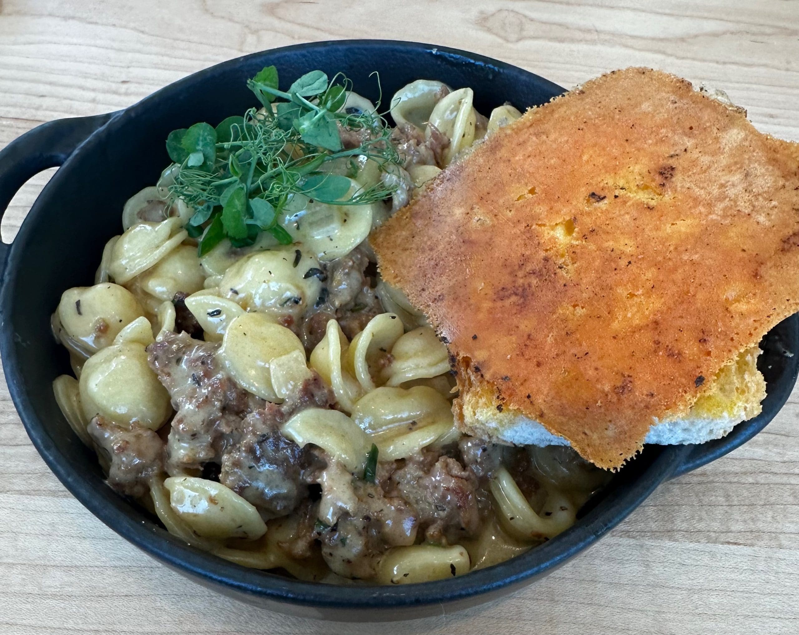 Found on the “large plates” section of the menu and served in a cast iron pan, the sweet fennel sausage orecchiette pasta is as good as you’ll find at great Italian restaurants, maybe better. It’s served with a garlic cheese bread. Orecchiette pasta, a pulled pasta shape that does indeed resemble an ear, offers a hollow spot perfect for absorbing sauces such as the wonderful, cheesy sauce on this dish. My Chicago born-and-bred bride literally expresses contempt for any sausage that isn’t redolent with fennel. She loved the sweet fennel sausage. Me, too. This is heart- and soul-warming comfort food at its very best.