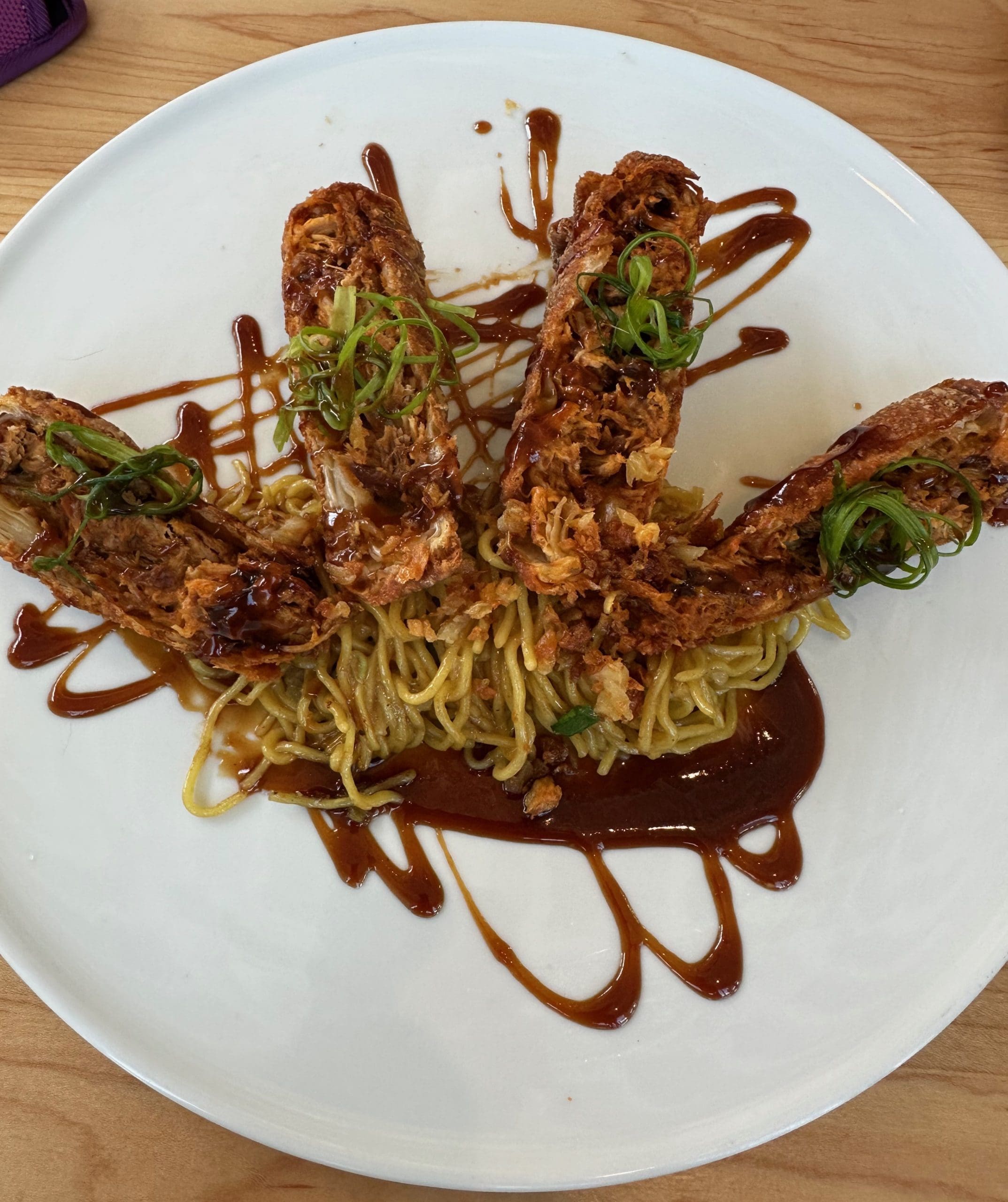 27 September 2024: Culinary historians claim that deep-fried egg rolls may have been invented in New York City’s Chinatown restaurants in the 1930s NOT in China. Sadly, egg rolls at most Chinese restaurants across the fruited plain haven’t improved much since. If you want a truly great egg roll, you once could visit Zinc Wine Bar & Bistro (closed in 2025) and ask for the duck confit egg rolls. They’re swoon-worthy. We had similarly high expectation for Ex Novo’s carne adovada egg rolls (two-hour braised pork shoulder, Tucumcari Cheddar, Hatch red chile soy) with a side of green chile lo-mein noodles.