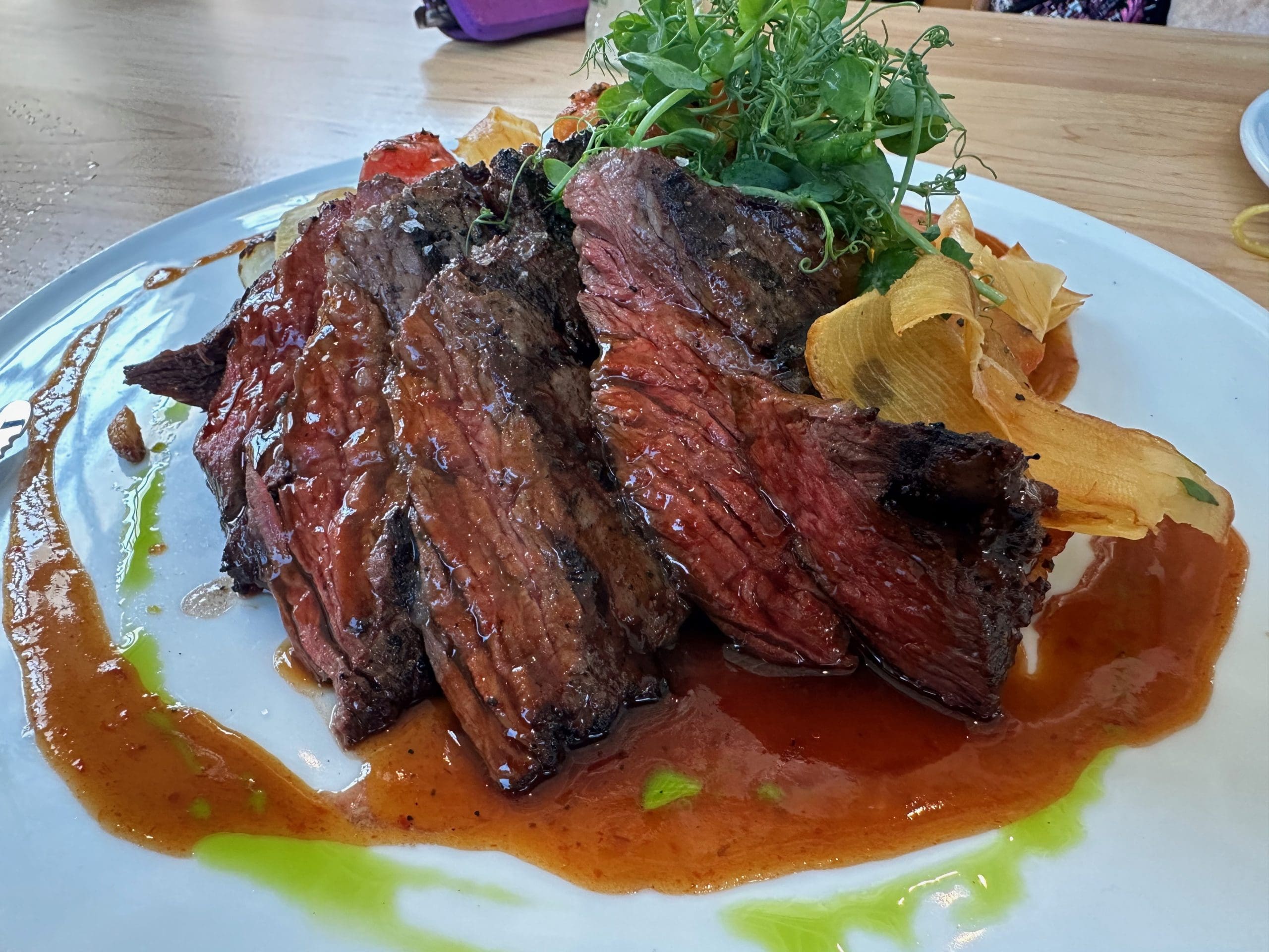 27 September 2024: One of the most popular dishes on Ex Novo’s large plates menu is the Churrasco steak and potatoes (outside skirt steak, twice-cooked potatoes, grilled tomato, caramelized corn, tomato coulis). The term churrasco actually refers to any meat grilled over an open flame. For the most part, that’s beef, usually a thin cut like skirt steak. Skirt steak is prized for its big, beefy flavor and affordability. It’s quite lean an has a lot of connective tissue with a thick grain that runs across the length of the muscle. While these attributes make it a tougher cut, it still emerges juicy and tender when marinated and not overcooked. It’s often used to make fajitas.