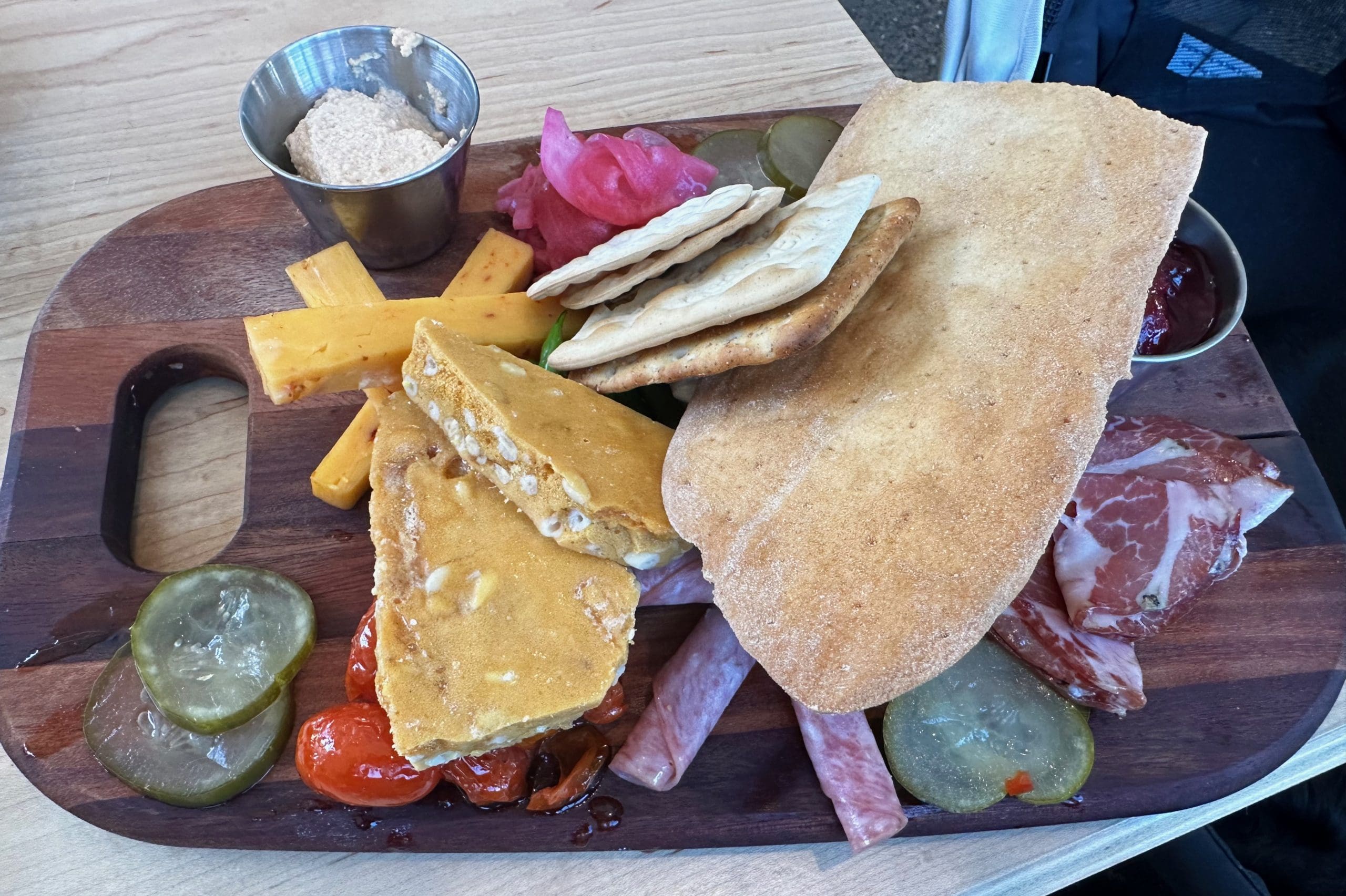 27 September 2024: Our inaugural visit to Ex Novo transpired on my Kim’s birthday. What she wanted most on her special day was charcuterie. Ex Novo offers two versions of its Downtown Charcuterie Plate (Heidi’s organic raspberry and poblano pepper jam, Aleppo pepper and agave, cured meats and local cheeses, crispy yucca, bread and sticks, piñon brittle and whipped sweet chile tofu). Every element in this board was exceptional. I even allowed myself a sweet indulgence by scarfing up all the piñon brittle.