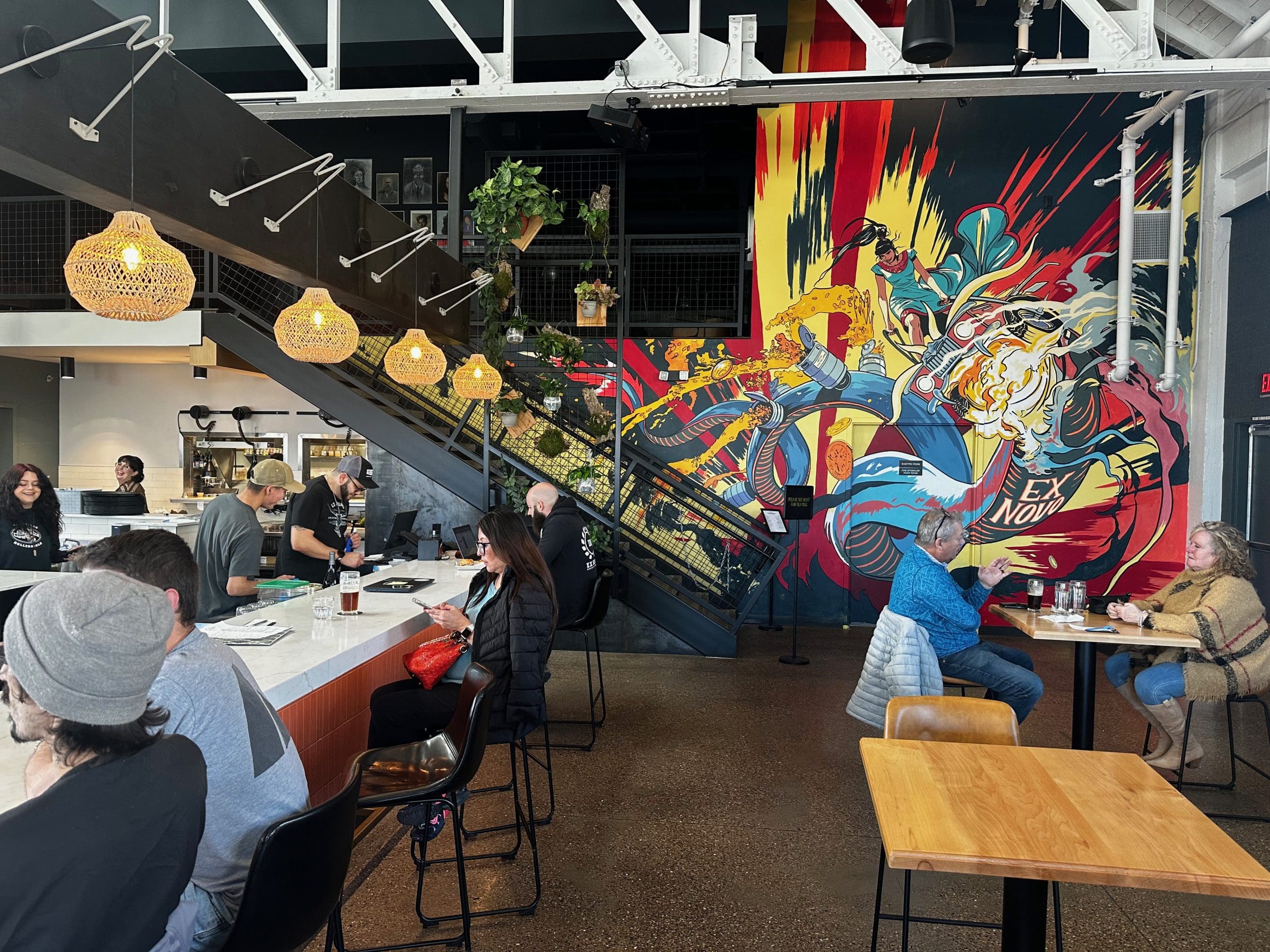 After years of design and construction, Ex Novo new taproom and restaurant opened its doors in July, 2024. The 11,500-square-foot edifice is broken into two levels. On the first level, you’ll find the restaurant, kitchen, taproom, indoor seating and a large patio. A full-service bar with food service can be found upstairs in the spectacular mezzanine. A large outdoor patio accommodates one-hundred guests and will eventually provide live music. An adjacent cafe and deli called Sammy’s Cafe & Deli.opened in October, 2024. Sammie’s offers an all-day breakfast menu as well as some of the most sought-after sandwiches imaginable (a pastrami reuben, banh mi, Italian, etc.)
