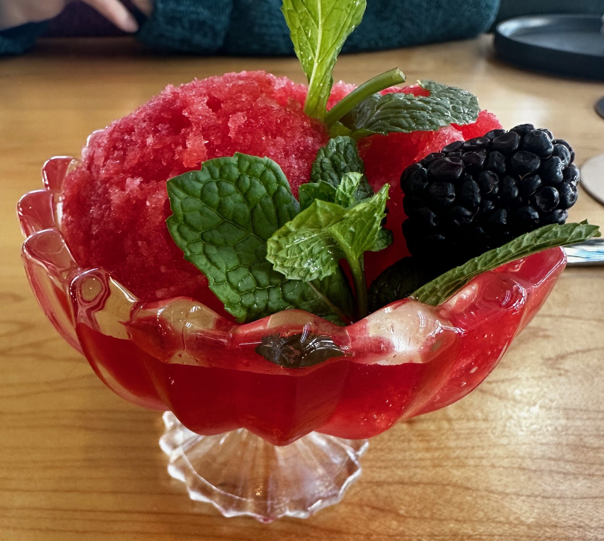 17 January 2025: If you’re wondering what the difference is between Italian ice and sorbet, let me turn it over to Real Simple: “Granitas (Italian ices) have ingredients that are identical to sorbet—pureed fruit (or juice), sugar, and water—but they differ in texture. Unlike sorbet, which is smooth-churned, granita is scraped repeatedly during the freezing process, loosening its structure into icy flakes.” In addition to four desserts, Ex Novo’s menu offers a sorbet. During our visit, the winter sorbet offering was blood orange. Talk about refreshing. Though listed as a winter sorbet, you can picture yourself enjoying this sorbet all year round, maybe especially in the summer.