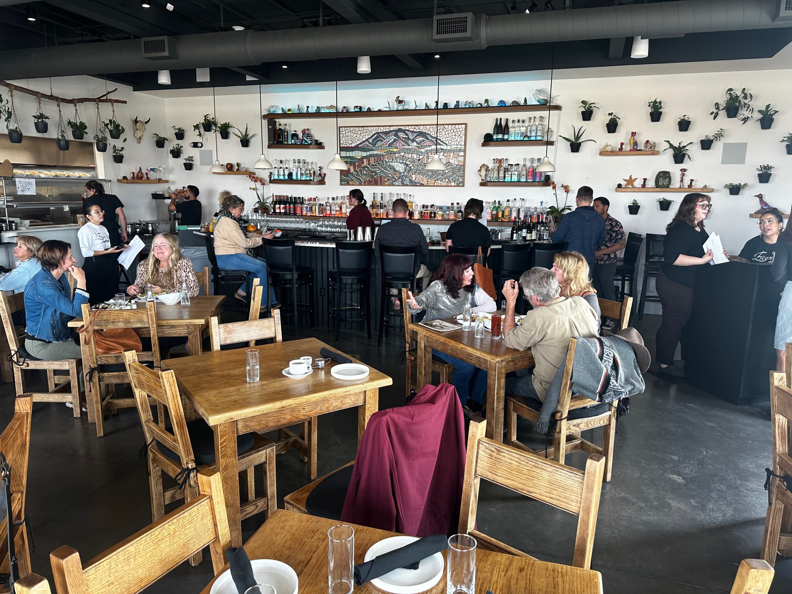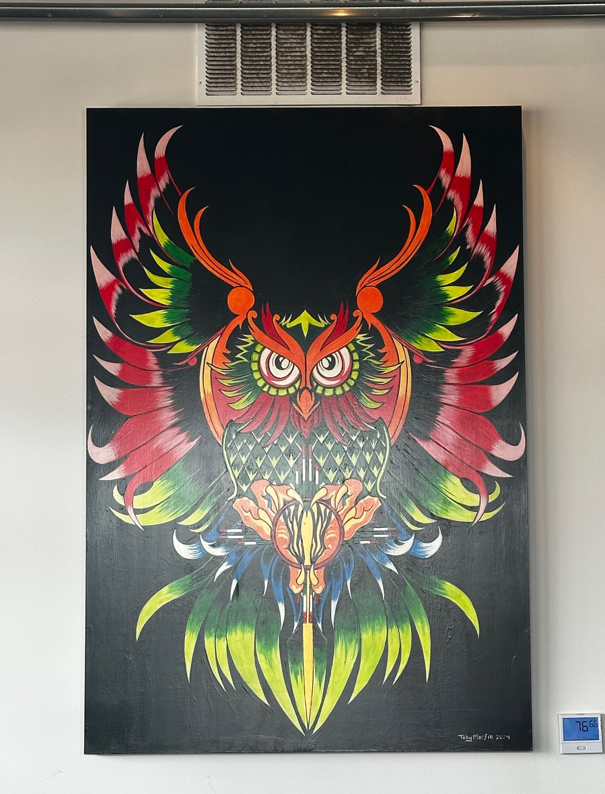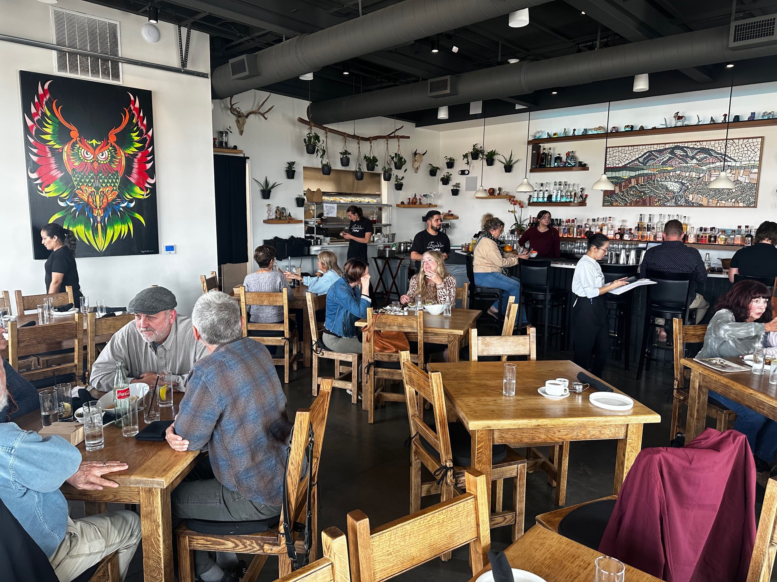 Chef Boyardee, whose patronymic actually sounds like “Boyardee” saw me taking photographs of the paintings on the wall and regaled me with background information about artist Toby Morfin and his works. Those works aren’t limited to the fine art on the wall. He is renowned for artwork on snowboards as well as skateboards. In 2023, the self-taught artist hosted the 17th annual Dia De Los Muertos Fine Art event. The event included an exclusive four-course dinner by Chef Ruiz. Chef (middle) and artist (right) are depicted on one painting. An even more colorful painting depicts an owl preparing to pounce on unsuspecting prey.