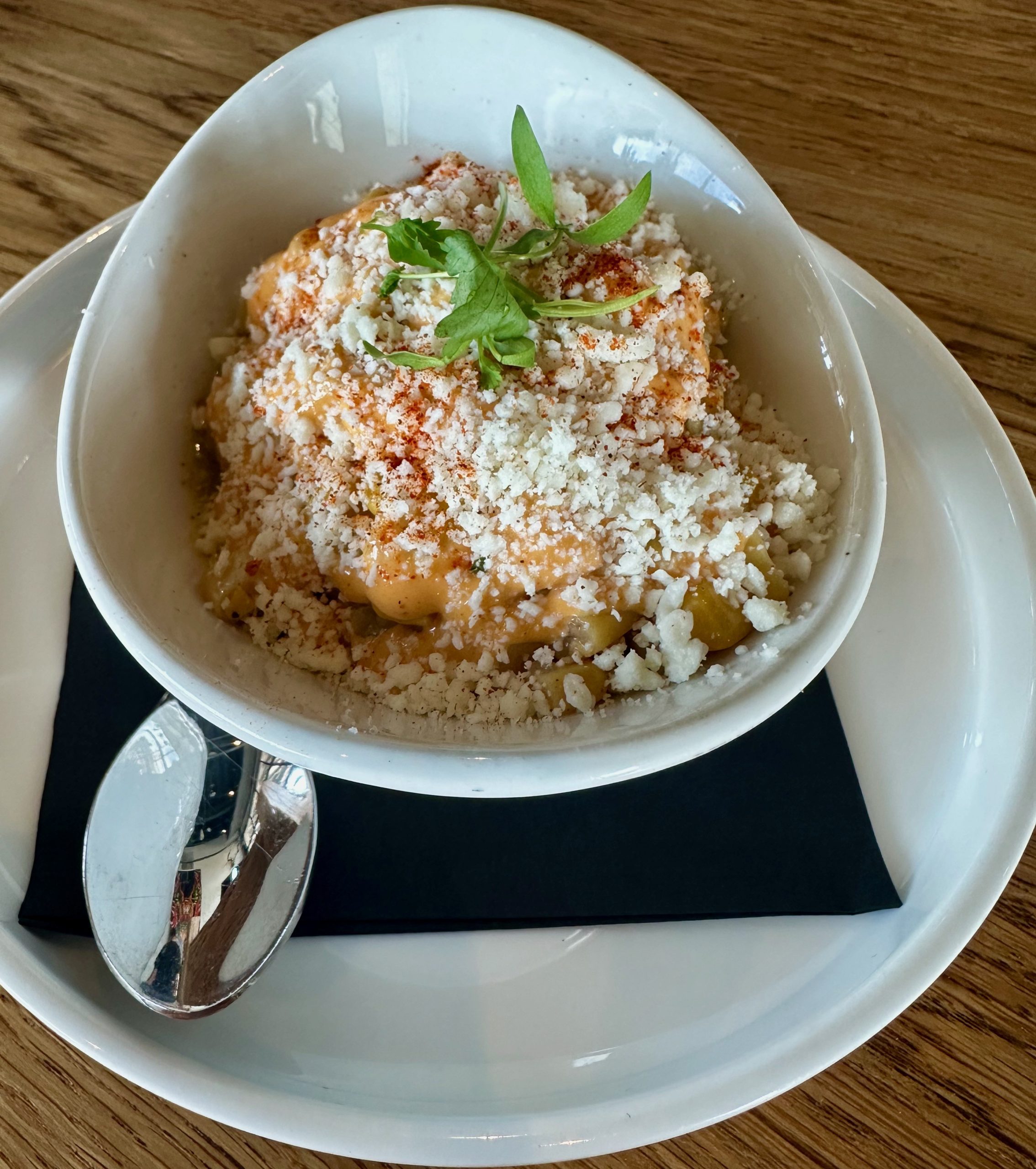 Though my inclination is usually to try something I’ve never previously had (or better still, never heard of) Esquites (Mexican street corn, lime, Cojita cheese, chipotle mayo, red chile powder) | have become an irresistible favorite. Esquites is a term for Mexican street corn served off the cob and in a cup, whereas elotes is Mexican street corn served on the cob. The esquites looked like a bowl of sunshine (albeit with a dusting of snow) and indeed, they had the same effect a ray of sunshine has on a cat perched on a window. With just the right amount of creaminess from the cotija paired with plenty of personality from the lime aioli and red chile, the esquites were a fabulous melange of ingredients and tastes that go so well together. I don’t recall ever having had better.