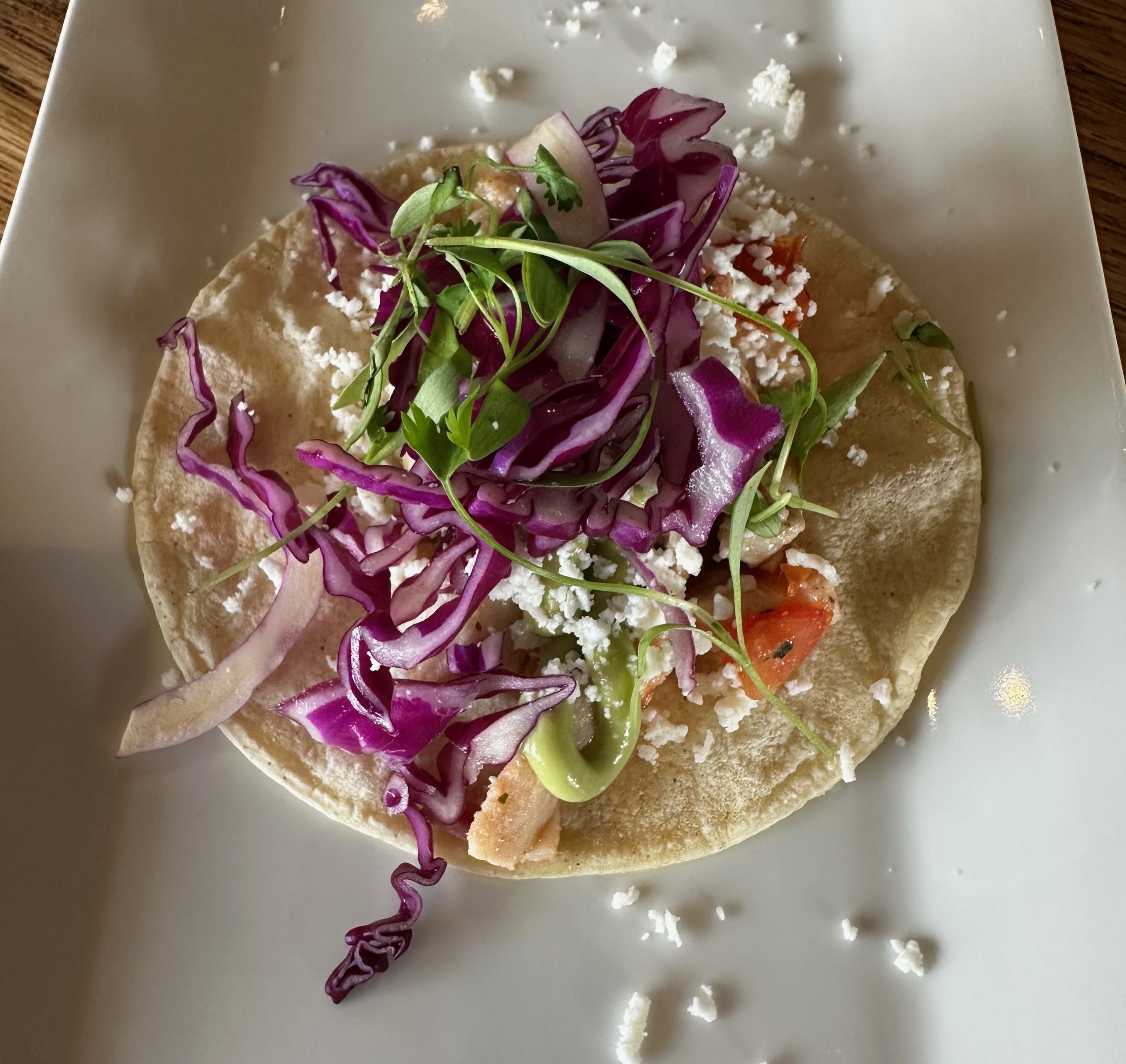 Tacos have become so ubiquitous across the fruited plain that they rival America’s sacrosanct burger as one of the country’s most popular and frequently consumed foods. Restaurants–irrespective of genre–offer their sometimes not so simple interpretations of the simple taco. Escondido offers eight different tacos on its menu: al pastor, carne asada, carnitas, barbacoa, chicken, vegetarian, Baja mahi mahi and shrimp. Four tacos per order are served, each garnished with purple cabbage, red and green housemade salsa, Cojita cheese and avocado mousse. Thank goodness for an accommodating kitchen staff for having served me one a la carte taco. At Bryan’s recommendation my one taco was the Baja mahi mahi, his favorite. The grilled, char-kissed taco was as good as advertised though the one drawback to having only one is that cravings for more are assured.