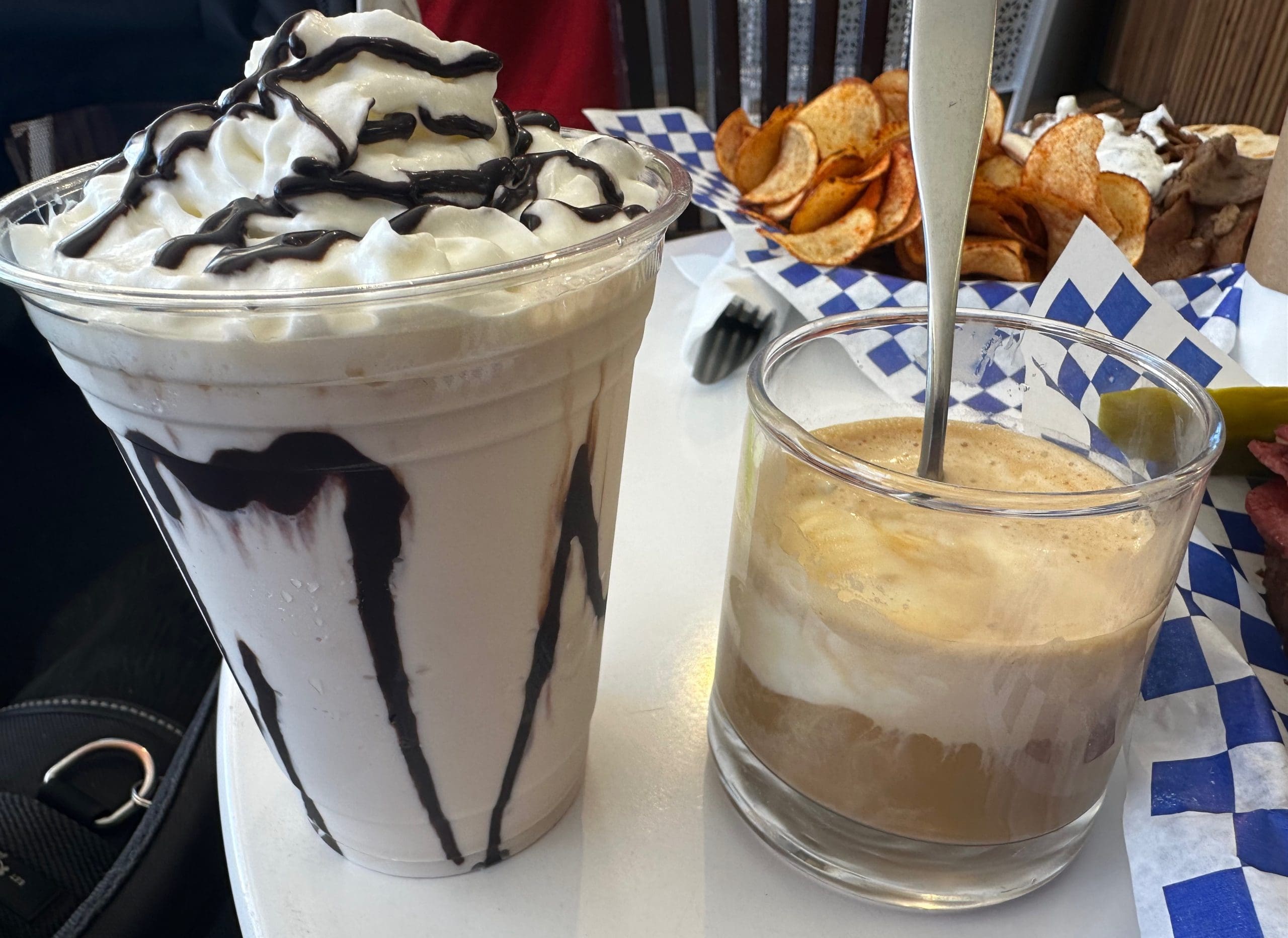 Having previously enjoyed Busy Bee’s fantastic custard, my Kim and I were very happy to find custard items on the menu. For her, a vanilla custard milk shake drizzled with chocolate syrup. If you believe shakes made from ice cream are terrific, you’ve got to have one made with custard. There is a significant difference in both flavor (custard is much richer) and mouthfeel. Custard is made with egg yolks while ice cream is not. My choice was affogato, also made with Busy Bee frozen custard. Affogato, a classic coffee dessert calls for a shot of espresso poured over vanilla ice cream or gelato. Once you’ve had it with frozen custard, you might not want it made with ice cream again.