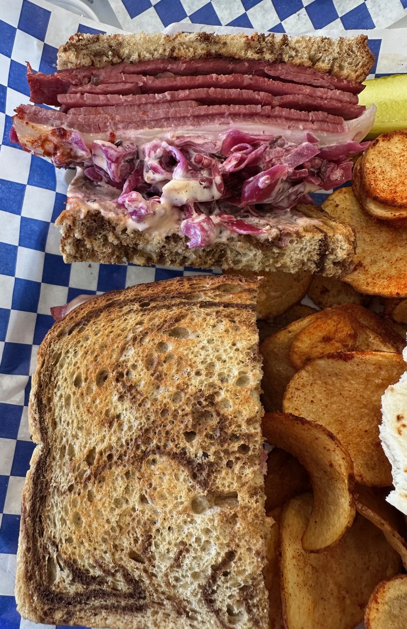 Chef Sandoval warned me that many items are portioned so generously that we’d probably take half home much of what we ordered. “Surely,” I thought “how big could a Reuben possibly be.” We found out a Reuben (grilled Boar’s Head corned beef topped with melty Provolone, house- made red cabbage habenero kraut, in house Russian sauce on marbled rye) can be pretty sizeable indeed. Layers upon layers of thinly sliced corned beef matched the thickness of the lightly toasted marbled rye. Russian dressing, a creamy, slightly piquant, salmon-hued spread made from mayonnaise, ketchup, and other ingredients beats Thousand Island dressing every time. This version was terrific as was the red cabbage habanero kraut though it wasn’t nearly as piquant as you migh expect. The Reuben is served with fresh housemade seasoned potato chips. As Chef Sandoval predicted, we took home half the Reuben and more than half the chips.
