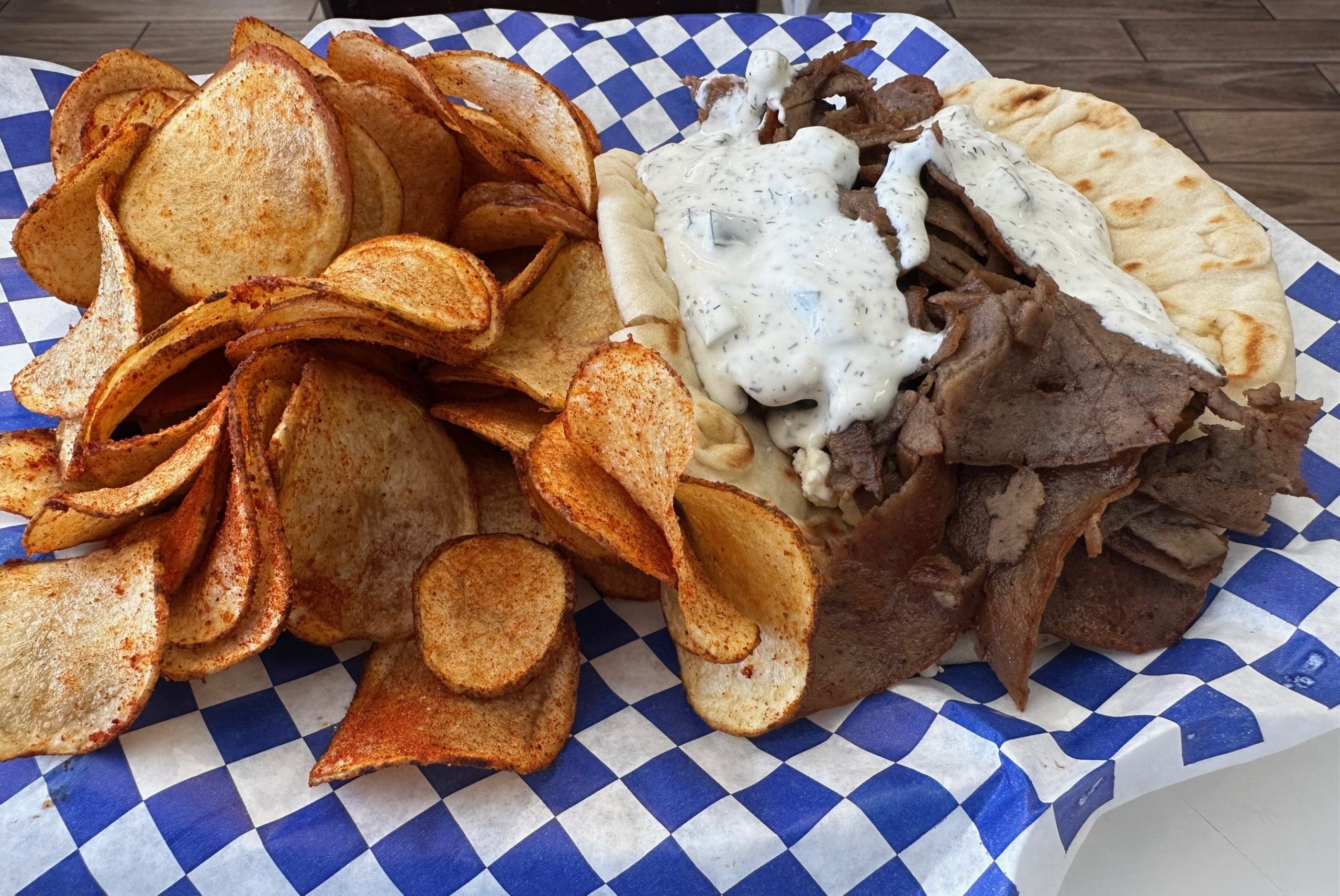 My Kim had been jonesing for gyros, meat cooked on a vertical rotisserie, then sliced and served wrapped or stuffed in pita bread. We were surprised to find gyros on the Cocinita’s menu which describes them as “hot lamb and beef from vertical spit served on pita bread, topped with lettuce, red onions, cherry tomatoes, tzatziki sauce and crumbled feta cheese. Served with house made seasoned potato chips.” The lamb-beef amalgam is moist, tender, and super aromatic from applied seasonings, but it’s the tzatziki sauce that makes this dish a winner. It’s made on the premises by Chef Sandoval an is among the best we’ve had in the area. My Kim couldn’t finish her gyros either so we took about half of it home for lunch the following day.