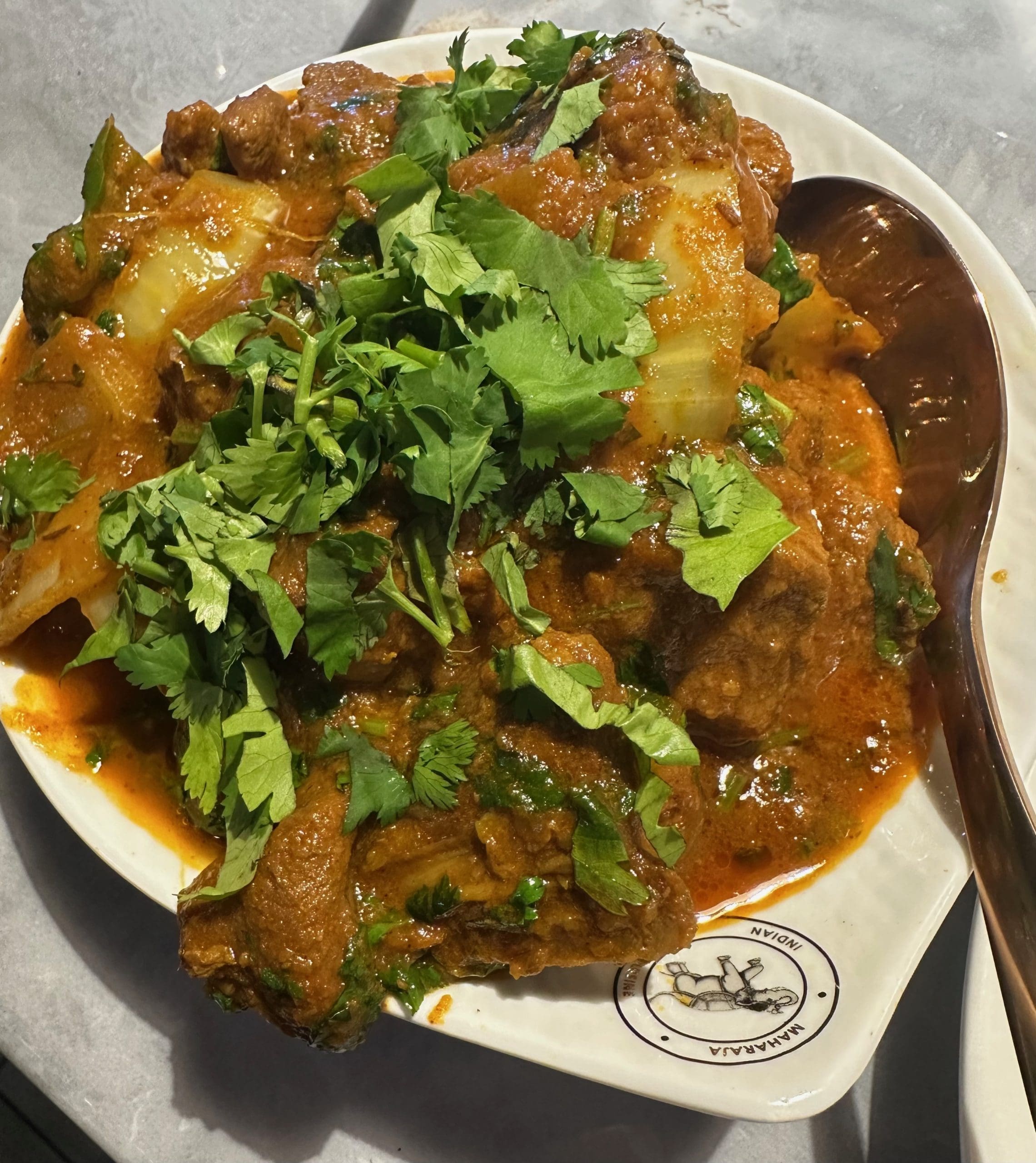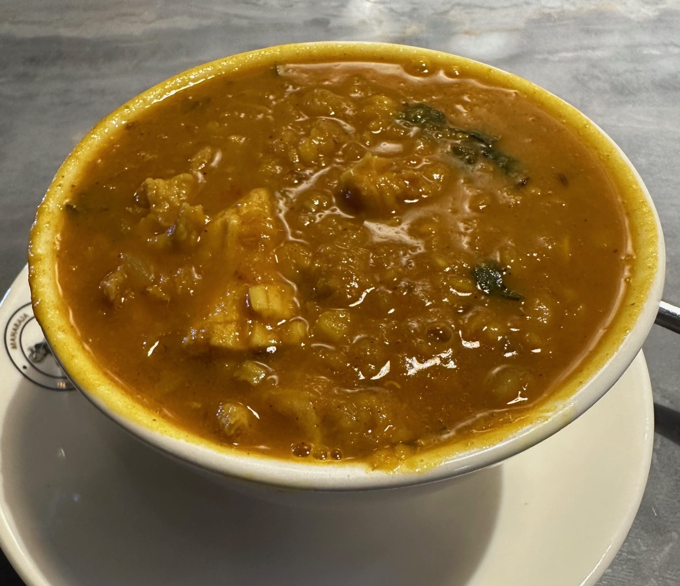 23 October 2024: A wonderful counterbalance to the cooling effect of lassi is one of the three hearty soups on the menu: mulligatawny soup, madras soup and dal soup. Mulligatawny may sound like the name of an Irish jig, but it has absolutely nothing to do with the Irish and is as far from Ireland as it gets. Mulligawny is a traditional curry soup which is rich in ingredients, comforting and absolutely delicious. It’s not purely an Indian soup. It’s an English soup inspired by an Indian recipe. The name roughly translates from Tamil as “pepper water”. The original Indian recipe is not even a soup, it’s a sauce that is served with rice. Maharaja’s version is among the very best I’ve had (though in the spirit of full disclosure, I’ve never had the Soup Nazi’s version).