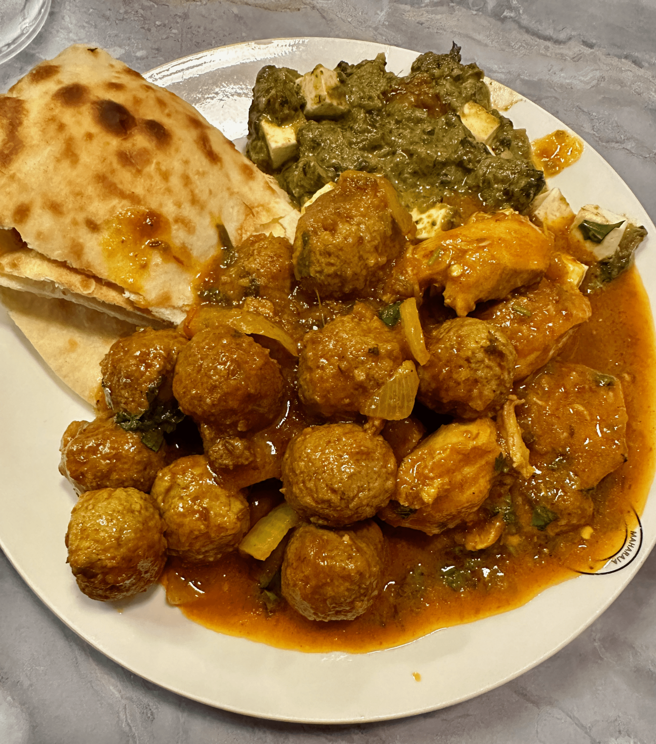 21 November 2025: My second visit to Maharajah took place on a rainy workday for Elaine Rising and Nader Kahlil, so much more than my very best friends at the University of New Mexico (UNM). Because they had to return to work, even I succumbed to the charms and enticements of the buffet. My plate was loaded with lamb meatballs, chicken vindaloo, saag paneer and naan. The chicken vindaloo is redolent with the bold, tongue-searing spices that render it fiery. It’s an addictive type of fiery. One trip to the buffet isn’t enough. As with most Indian buffets, the challenge is keeping featured items on gleaming metal trays warm and fresh. Only the naan suffered the indignity of drying up and acquiring a crispy texture. Everything else was warm and delicious.