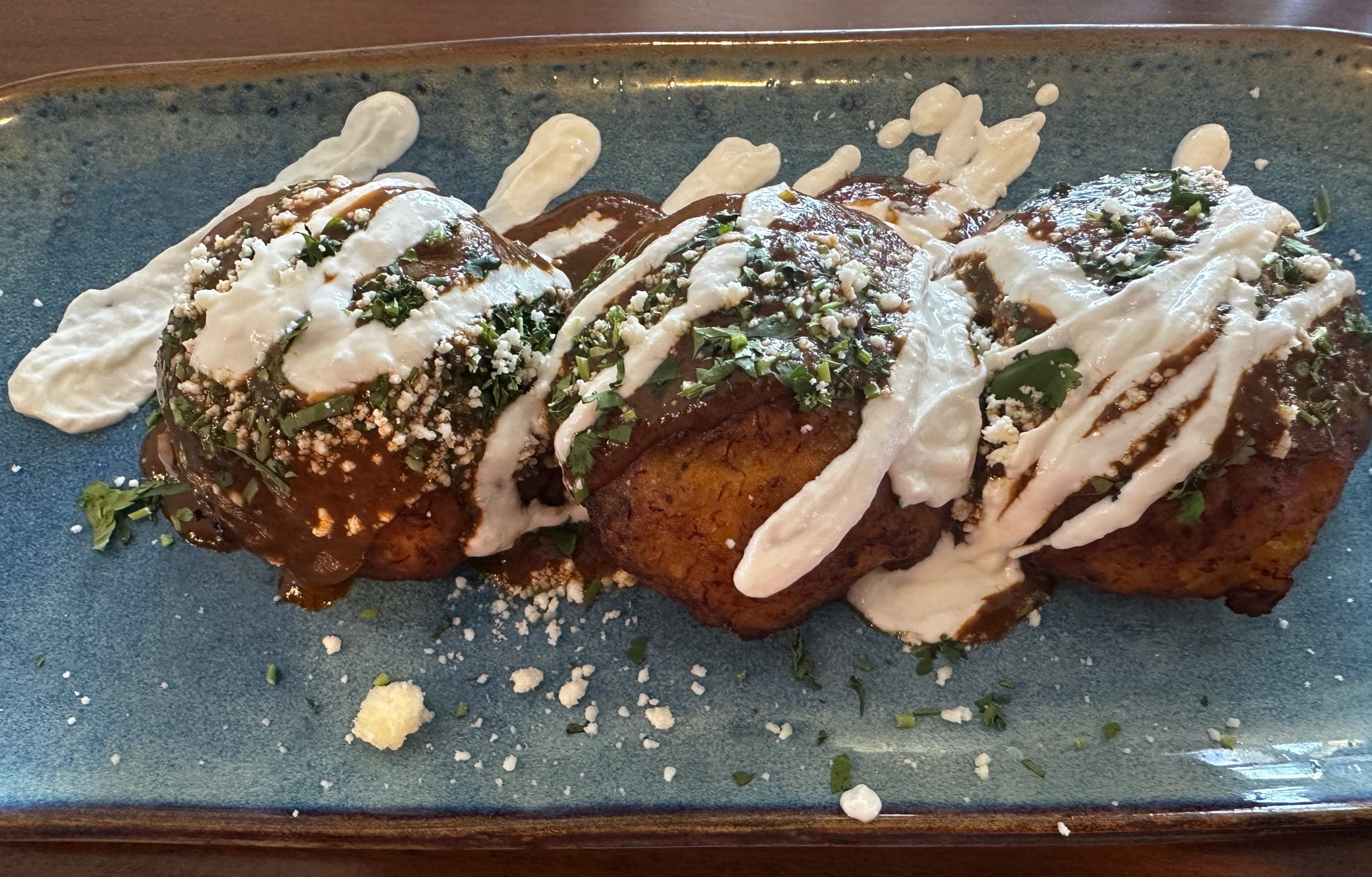 We were delighted to find that Fiesta Azul offers a plantain-based starter we hadn’t seen in New Mexico’s Mexican restaurants. That surprising appetizer is called molotes (three plantains filled with queso fresco, chorizo, topped with sour cream, and mole negro). At the very least, it’s an interesting appetizer, but not a very balanced one. Despite the presence of queso fresco, sour cream and chorizo, the dominant flavor notes were almost almost dessert sweet. We had expected a dish somewhere along the line of chiles relleno en nogada which does have a wonderful balance of sweet and savory notes.