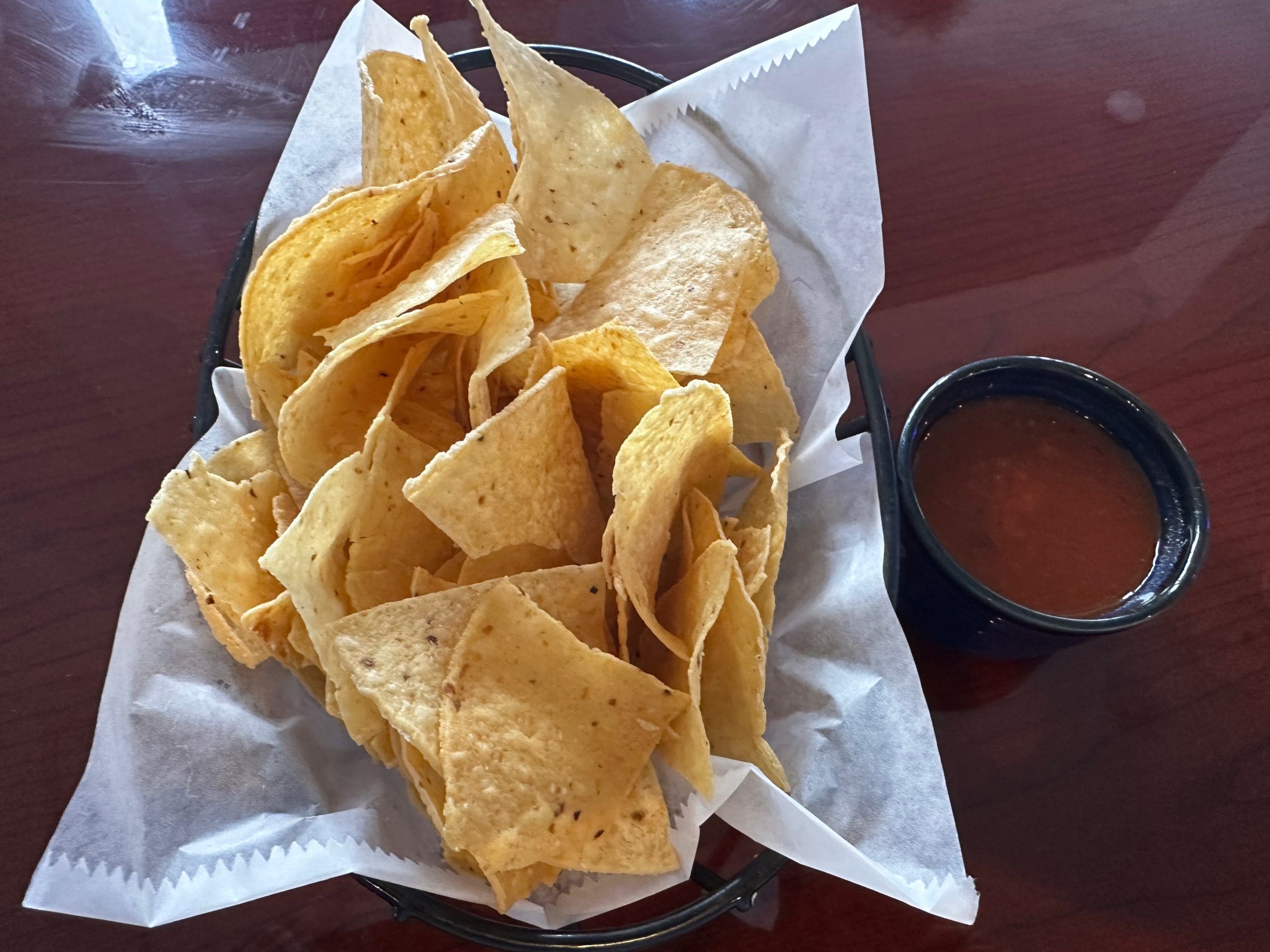 We knew right off we’d like Fiesta Azul when our server ferried over a bowl of salsa and basket of chips to our table. Fiesta Azul is a rarity in that salsa and chips are complimentary. The salsa is served in a ramekin. You’ll quickly dispense of the salsa (which has very little bite), but your server (ask for Xavier) will replenish it. Chips are rather on the thin and brittle side and tend to break with Gil-sized scoops. Those chips are low in salt and don’t have a pronounced corn flavor, but they’re quite good for the price.