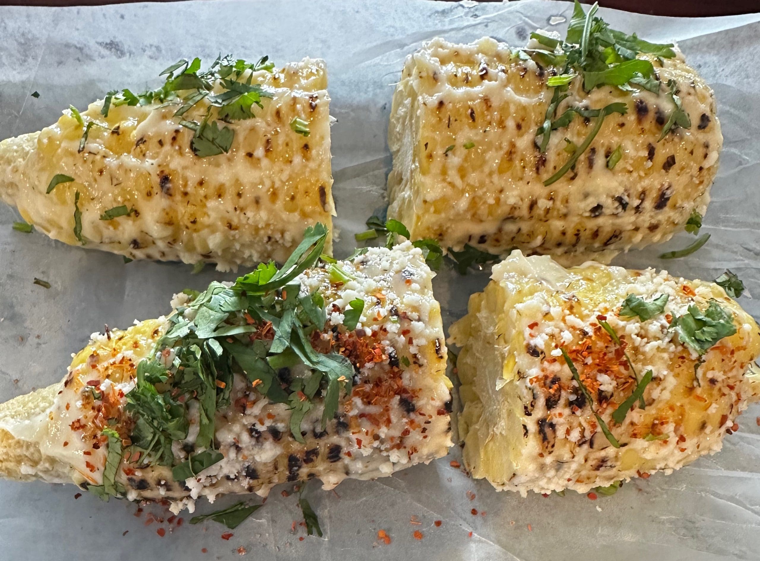 Fiesta Azul’s menu is extensive and a pleasure to peruse. You’ll likely narrow down to about six to ten items what you’d love to try. That’s what future visits are for. The appetizer menu alone lists some lucky thirteen items. Not all of them are the de rigueur offerings you’ll find at other Mexican restaurants. You don’t, for example, often see melotes (three plantains filled with queso fresco and chorizo, Topped with sour cream, and Mole negro) on an appetizer menu. Testament to the menu’s authenticity is that you’ll find both elotes (grilled corn on the cob with mayonnaise, fresh lime, cotija cheese and Tijan chili powder) and esquites (grilled corn off the cob, chipotle mayonnaise, fresh lime juice and cotija cheese) on the menu. Even better, you can opt to exclude an ingredient from your corn. For my Kim that meant no Tijan chili powder. The elotes are sweet and nicely roasted though rather on the puny side.